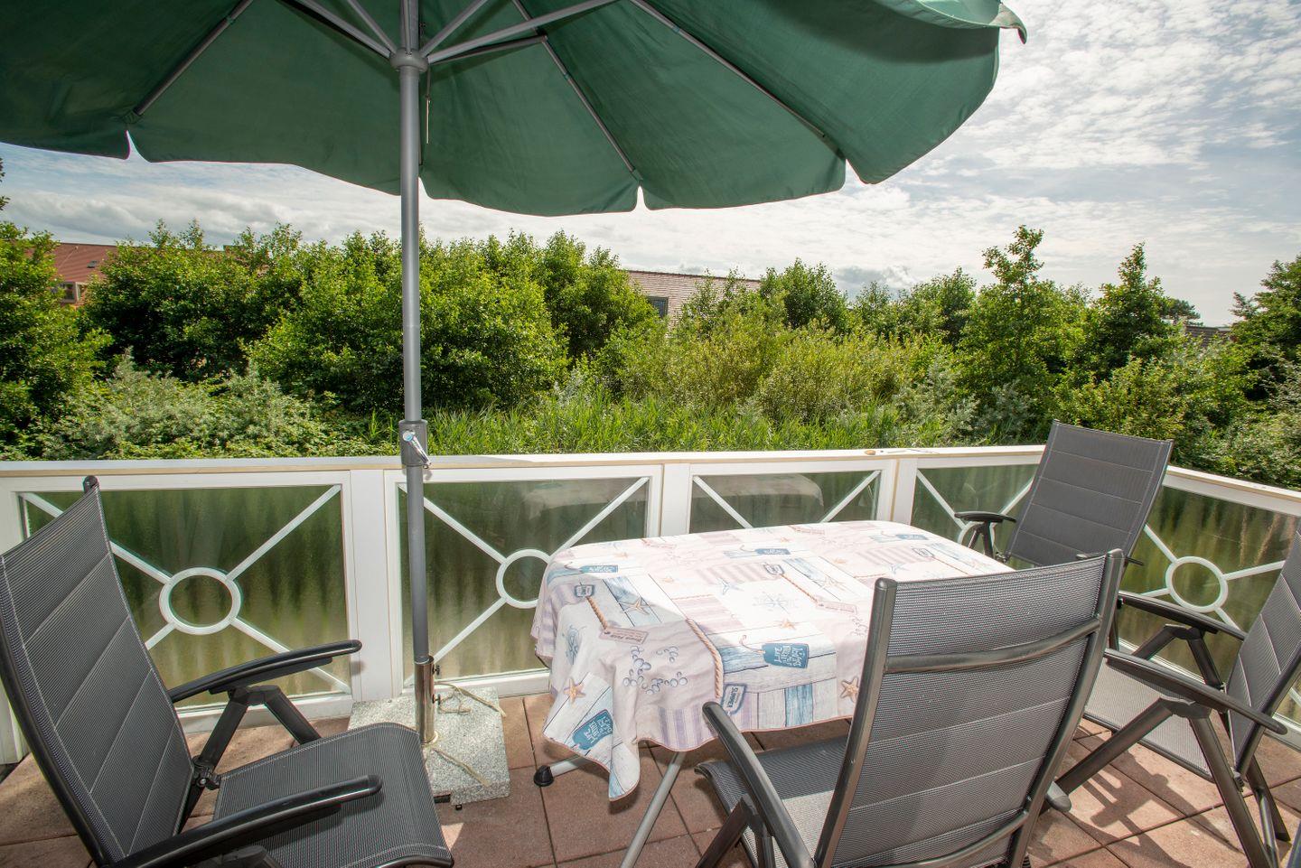 Der gemütliche Balkon mit Sitzecke, Sonnenschirm und Blick ins Grüne lädt zu gemütlichen Stunden ein.