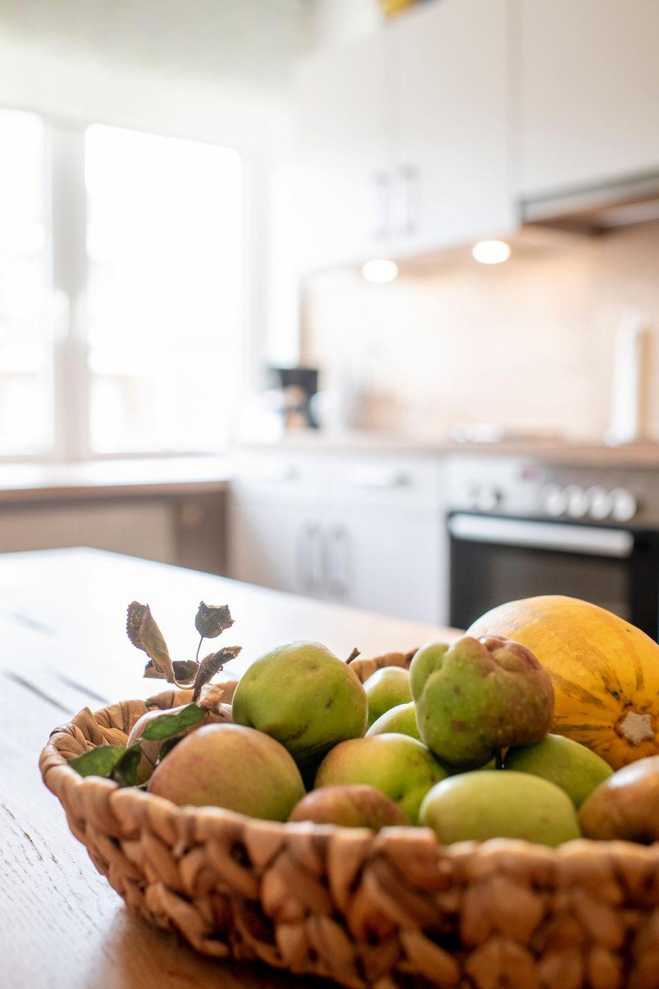 Die getrennte moderne Küche mit trendiger Sitzbank und großzügigem Esstisch ist mit allem ausgestattet.