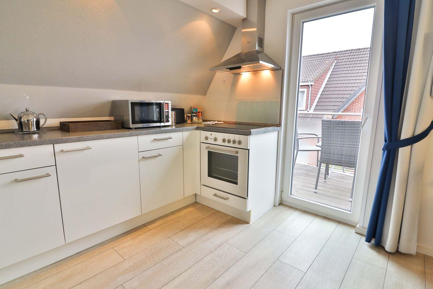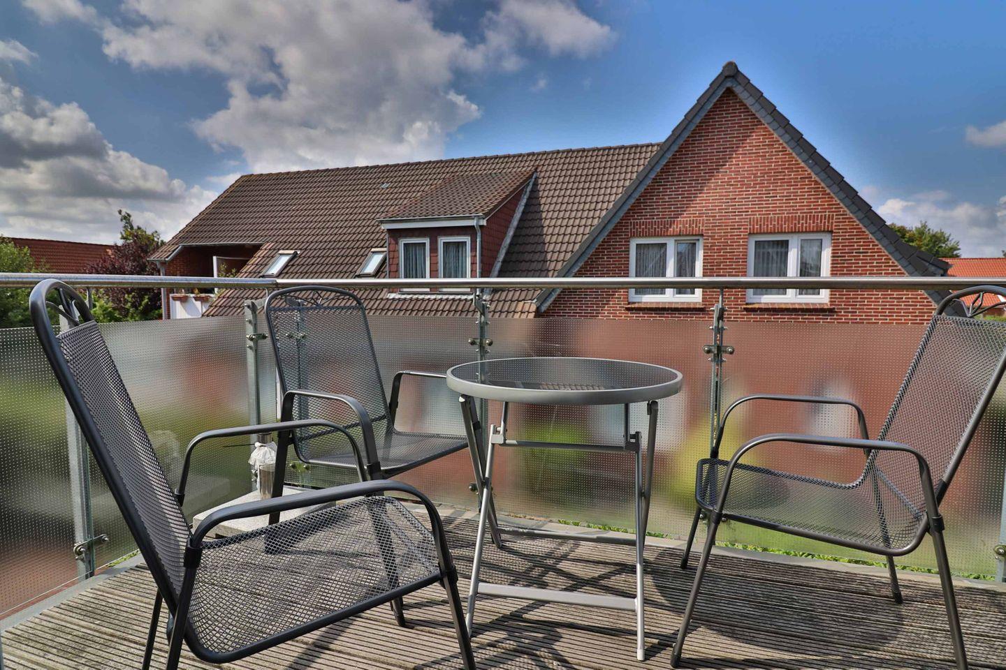 Ein großer Westbalkon lädt zum Entspannen an der frischen Nordseeluft ein. Genießen Sie dabei den Ausblick und nutzen Sie die vorhandenen Gartenmöbel sowie den Sonnenschirm, um auch außerhalb der Wohnung entspannte Stunden zu verbringen.