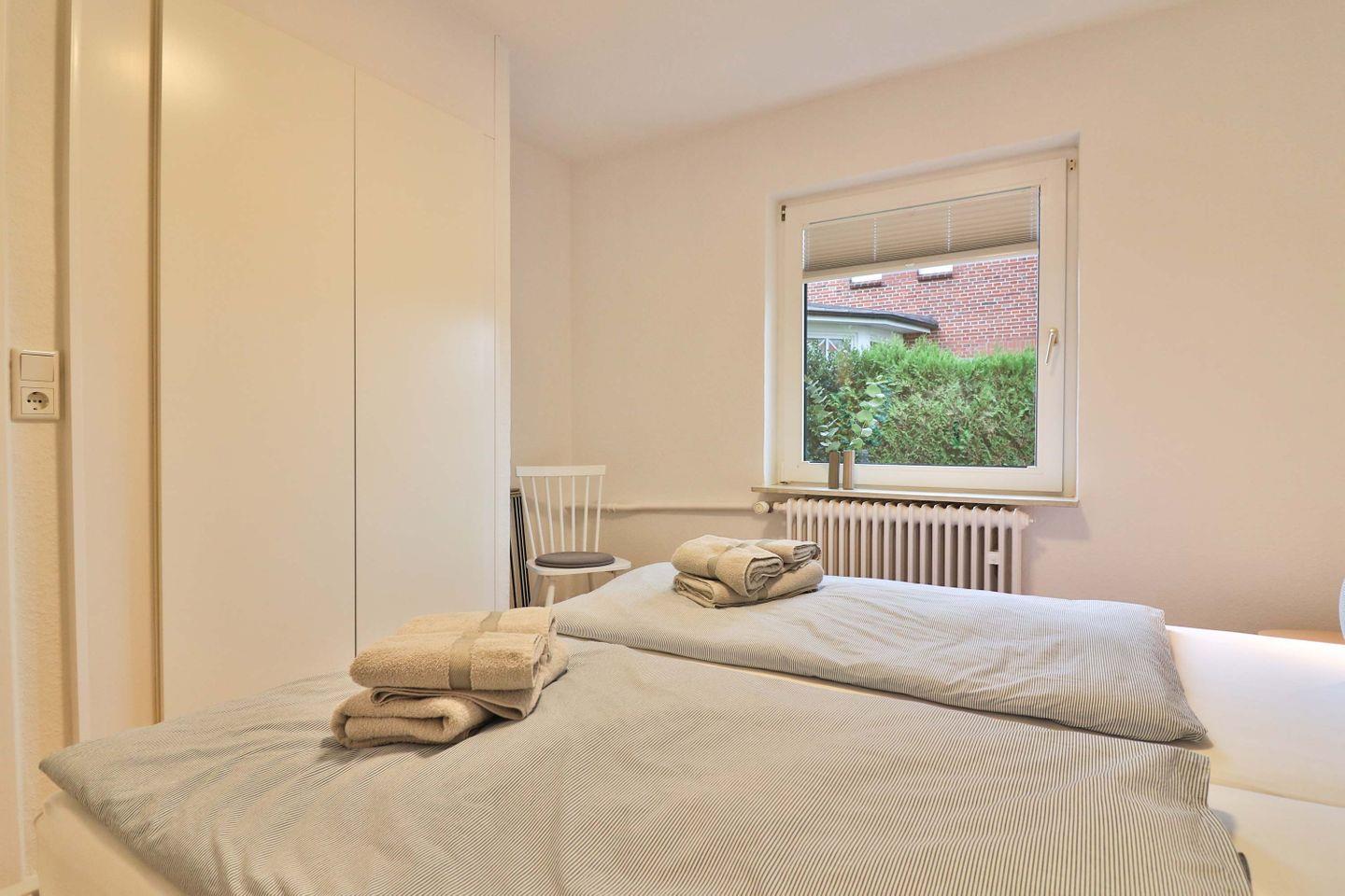 Das Badezimmer verfügt über eine Dusche, Waschbecken, Handtuchheizkörper, Fenster sowie ein WC. Ein Haartrockner sowie ausreichend Handtücher und Bettwäsche gehören ebenfalls zur Ausstattung.