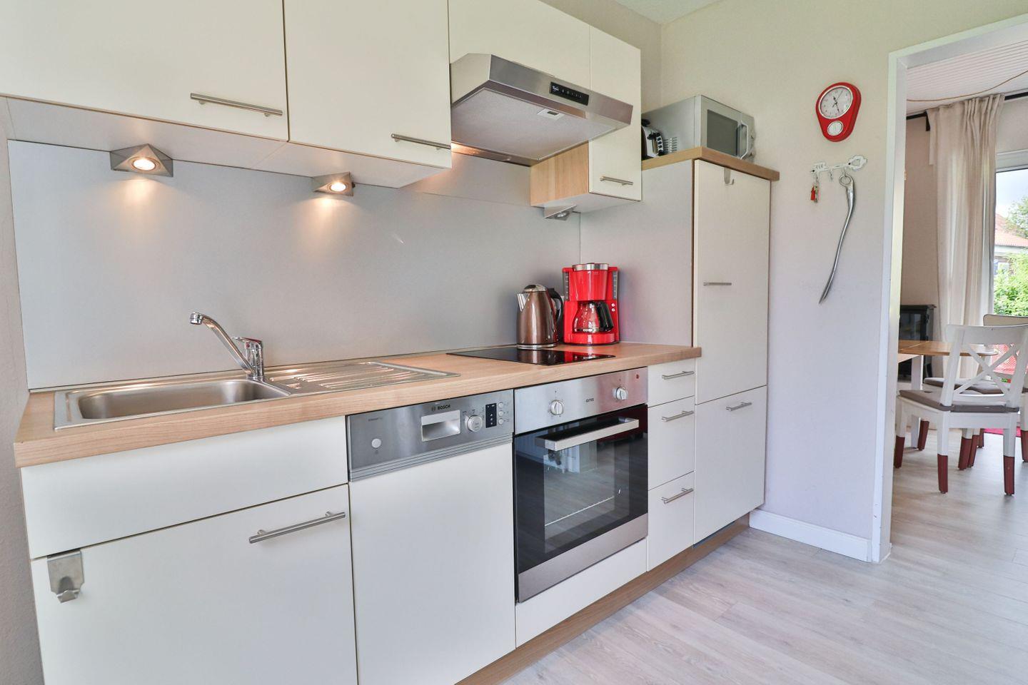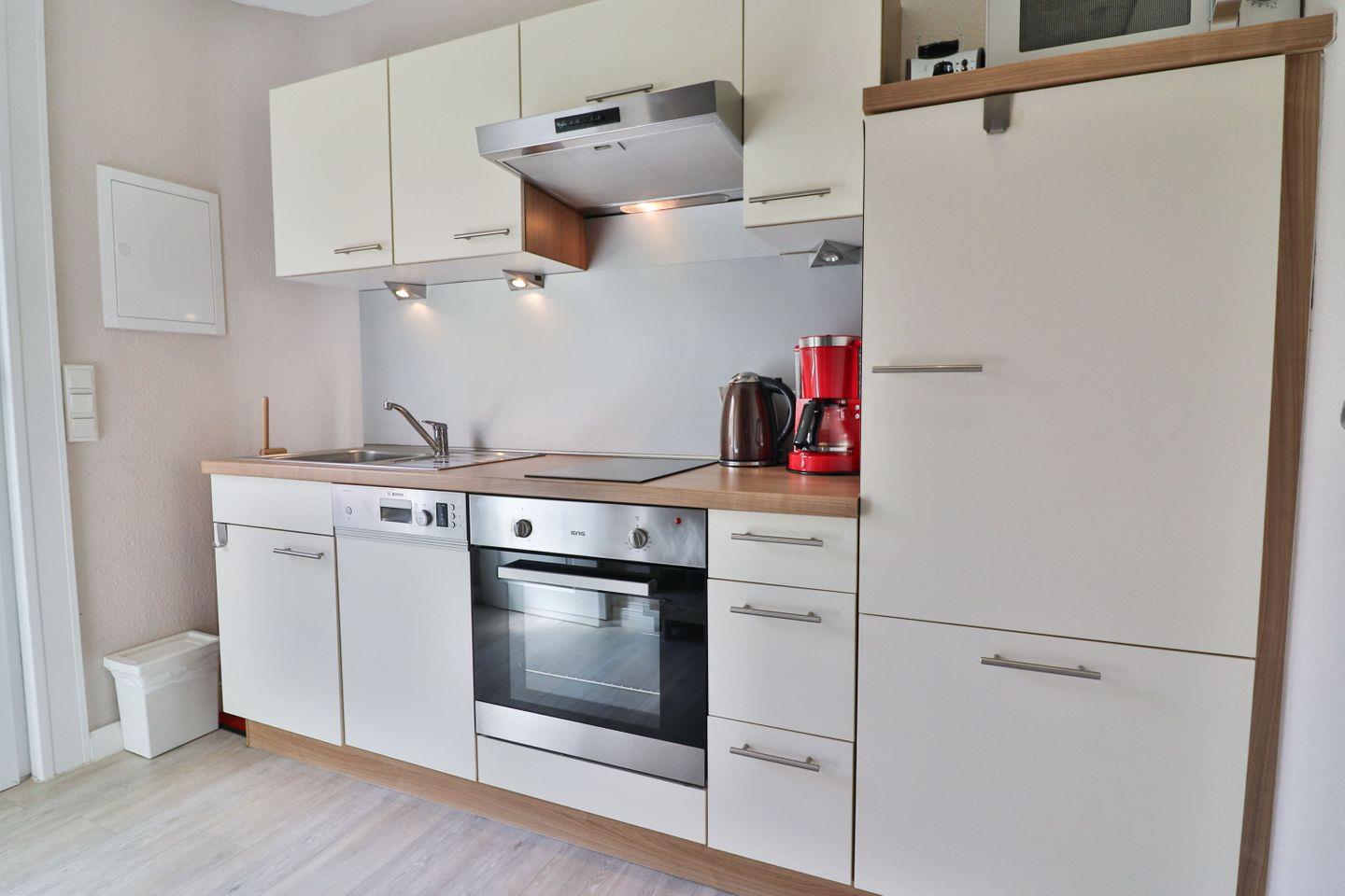 Die Küchenzeile besteht aus einem 2-Platten-Ceranfeld, einem Backofen, einem Kühlschrank mit Gefrierfach und einer Spülmaschine.
