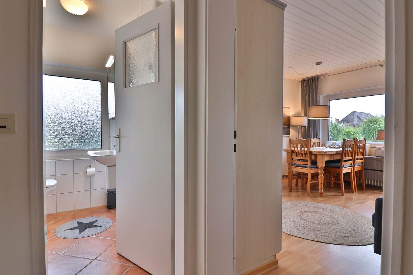Ein besonderes Highlight ist der teilüberdachte, geschlossene Südbalkon. Ausgestattet mit Gartenmöbeln und Markise, lässt sich hier ein geschützter Rückzugsort im Freien genießen. Sämtliche Fenster der Unterkunft verfügen über Sichtschutz, sodass ausreichend Privatsphäre gewährleistet ist.