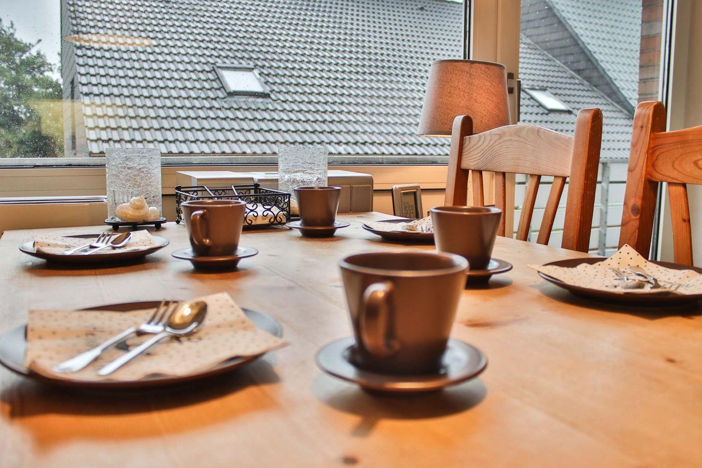 Die offene Küche ist mit modernen Geräten und umfangreichem Zubehör ausgestattet. Ihnen steht ein moderner 4-Platten-Herd, ein Backofen sowie ein Kühlschrank mit integriertem Gefrierfach zur Verfügung. Die Zubereitung von Speisen wird durch eine Spülmaschine, verschiedene Kaffeemaschinen (Senseo, Tassimo und Filter), Wasserkocher, Toaster, Mixer und vielfältige Küchenutensilien und Geschirr unterstützt.