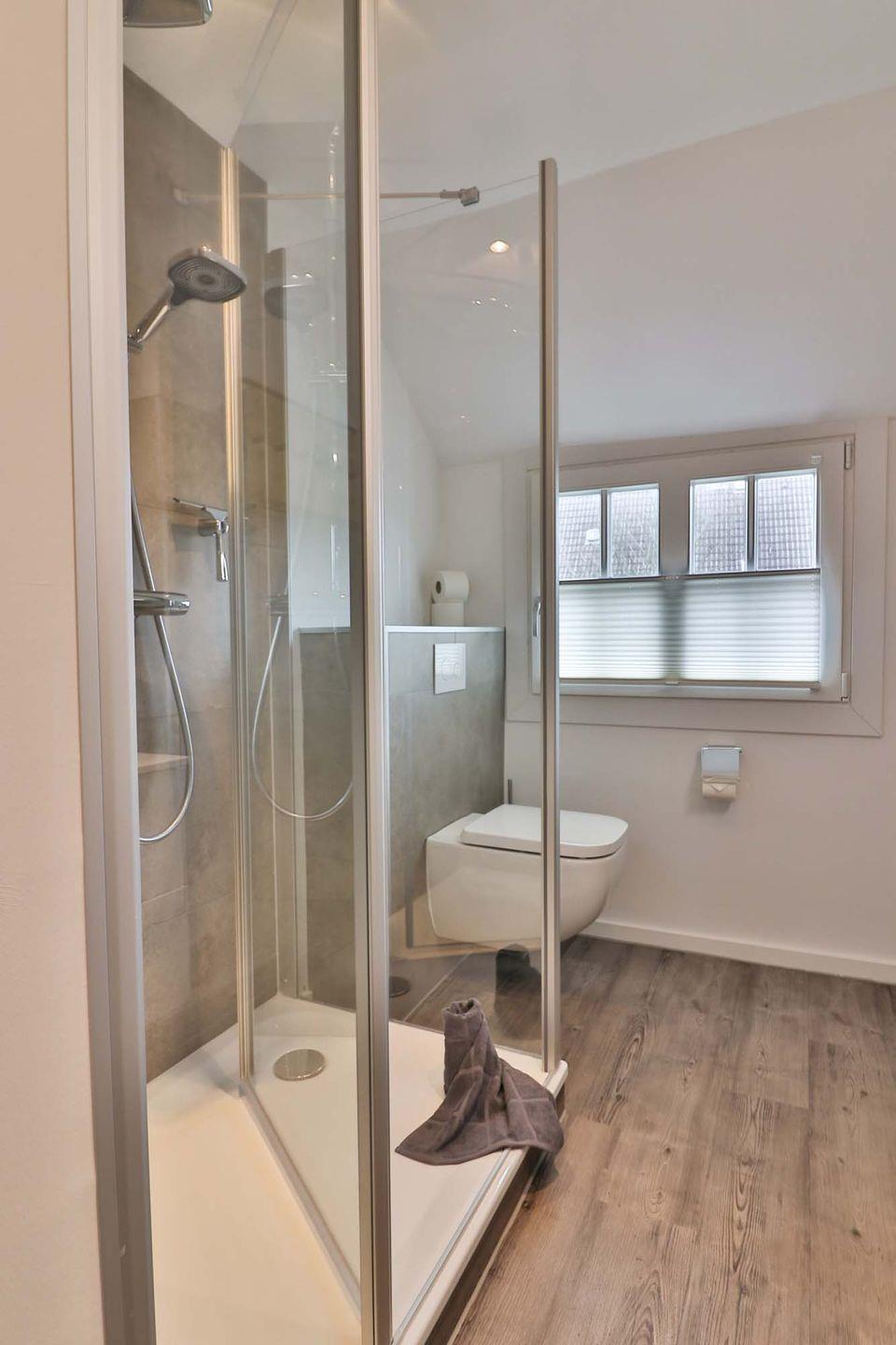 Im Badezimmer befindet sich die Dusche, das WC, ein Waschbecken und ein Haartrockner.