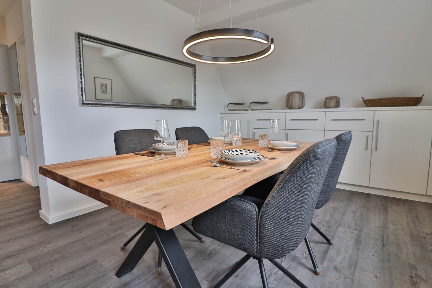 Im großzügigen Wohn- und Esszimmer befindet sich zum einen der große Esstisch mit Sesseln und zum anderen ein gemütlicher Wohnbereich mit einem Sofa, Sessel und Fernseher. Besonderes Highlight in diesem Zimmer ist der Kamin, der gerade an kalten Inseltagen für eine gemütliche Atmosphäre und Wärme sorgt.