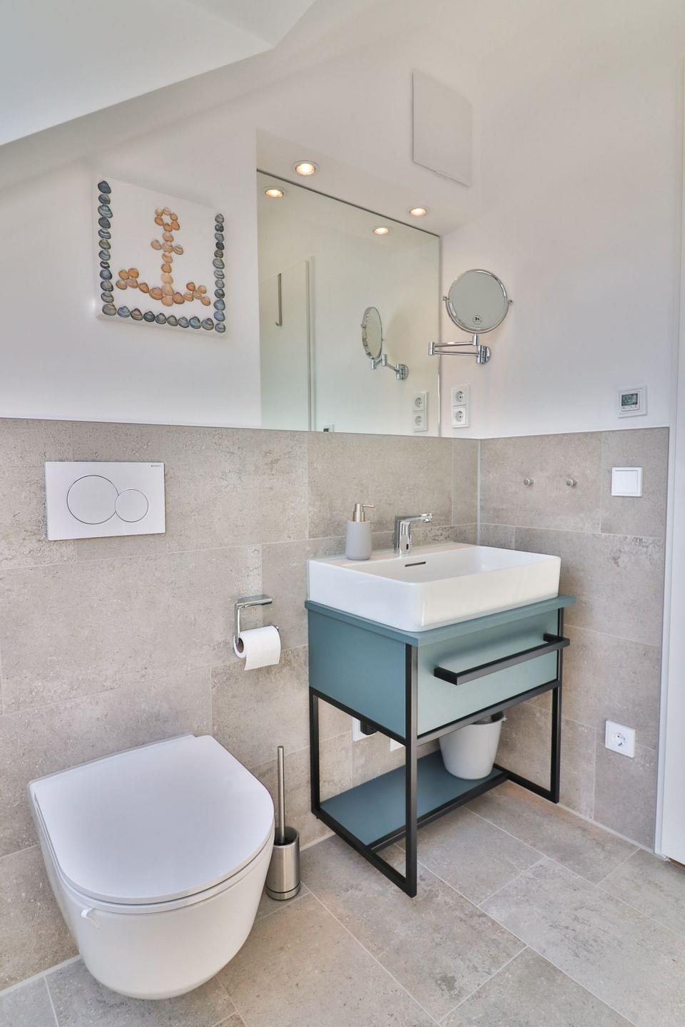 Im modernen Badezimmer finden Sie eine große Dusche, das WC, ein Waschbecken mit Schrank, ein Spiegel und einen Haartrockner.