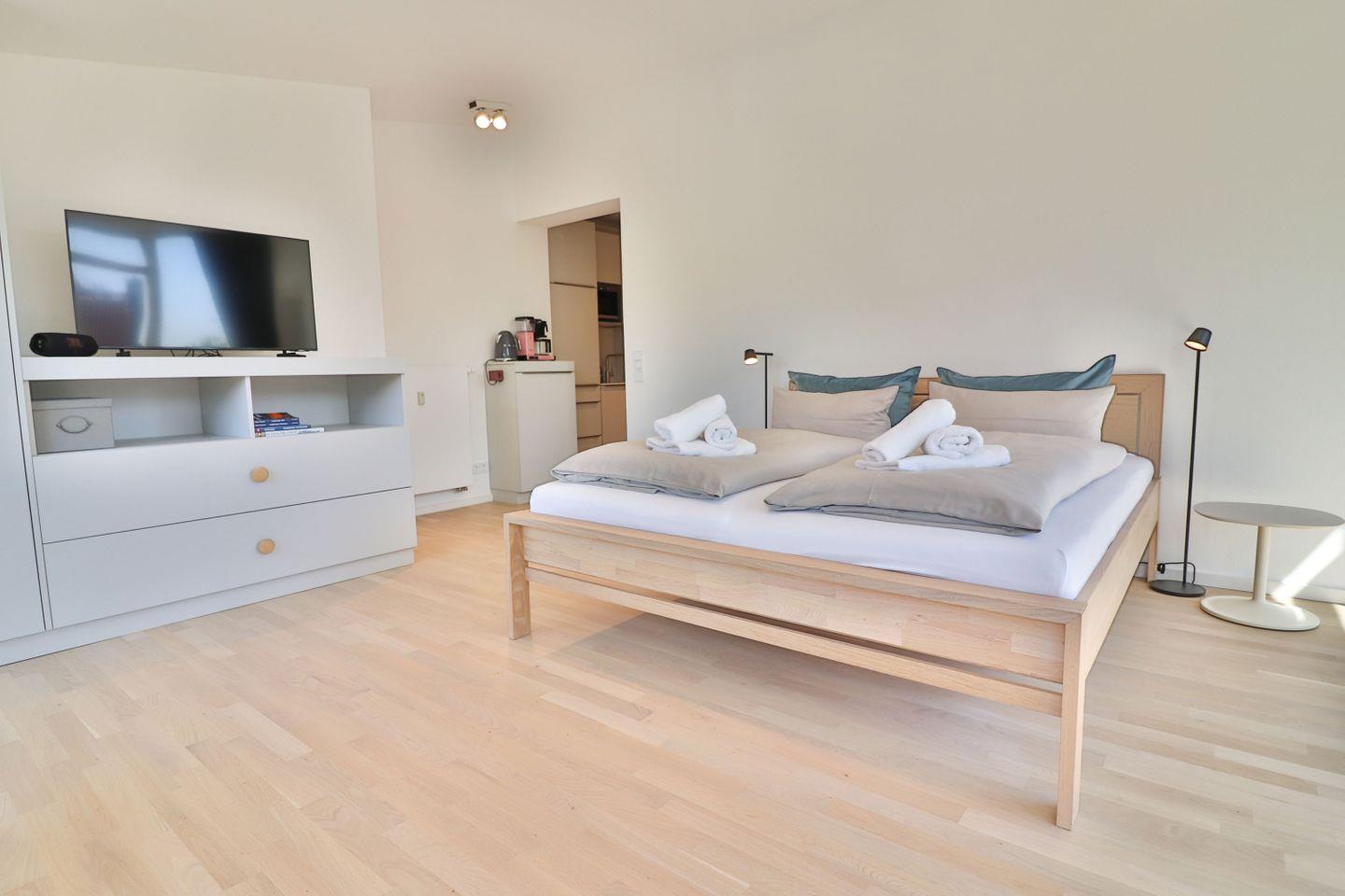 Das Ein-Raum-Apartment besticht besonders durch seine großen, bodentiefen Fenster – dadurch ist es sehr hell, wirkt optisch größer und bietet eine schöne Aussicht ins Grüne. In der Mitte des Zimmers befindet sich das große, gemütliche Doppelbett (180 x 200 cm). In einem großen Kleiderschrank können Sie bequem Ihr Gepäck für Ihren Urlaub verstauen. Für Unterhaltung sorgt ein Fernseher und ein Bluetooth-Lautsprecher. Der Esstisch und Sessel runden die Einrichtung im Apartment ab.