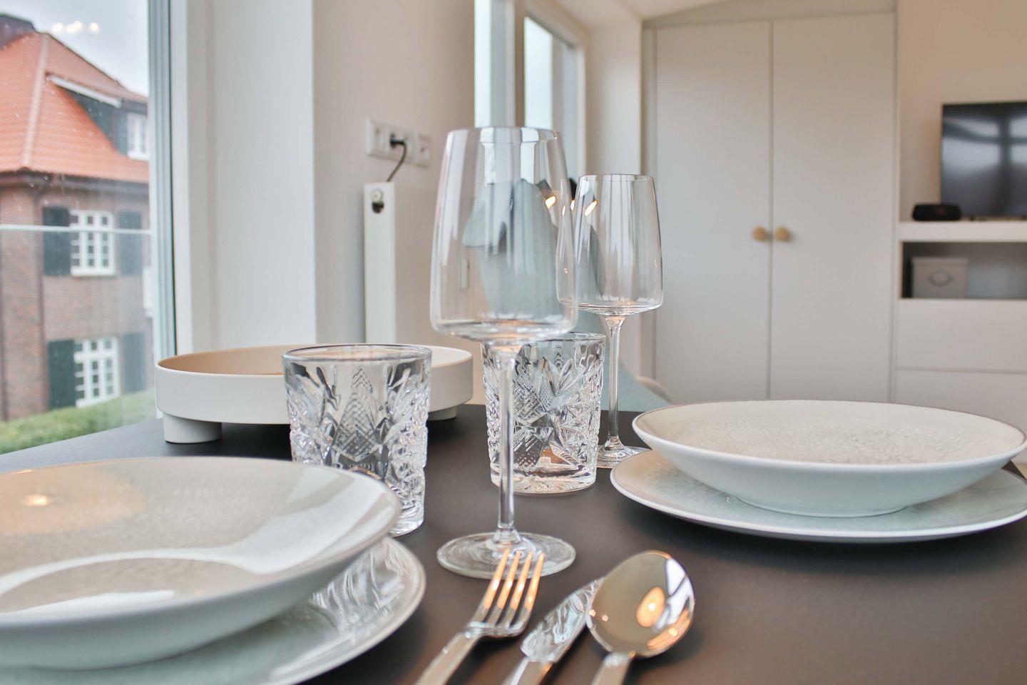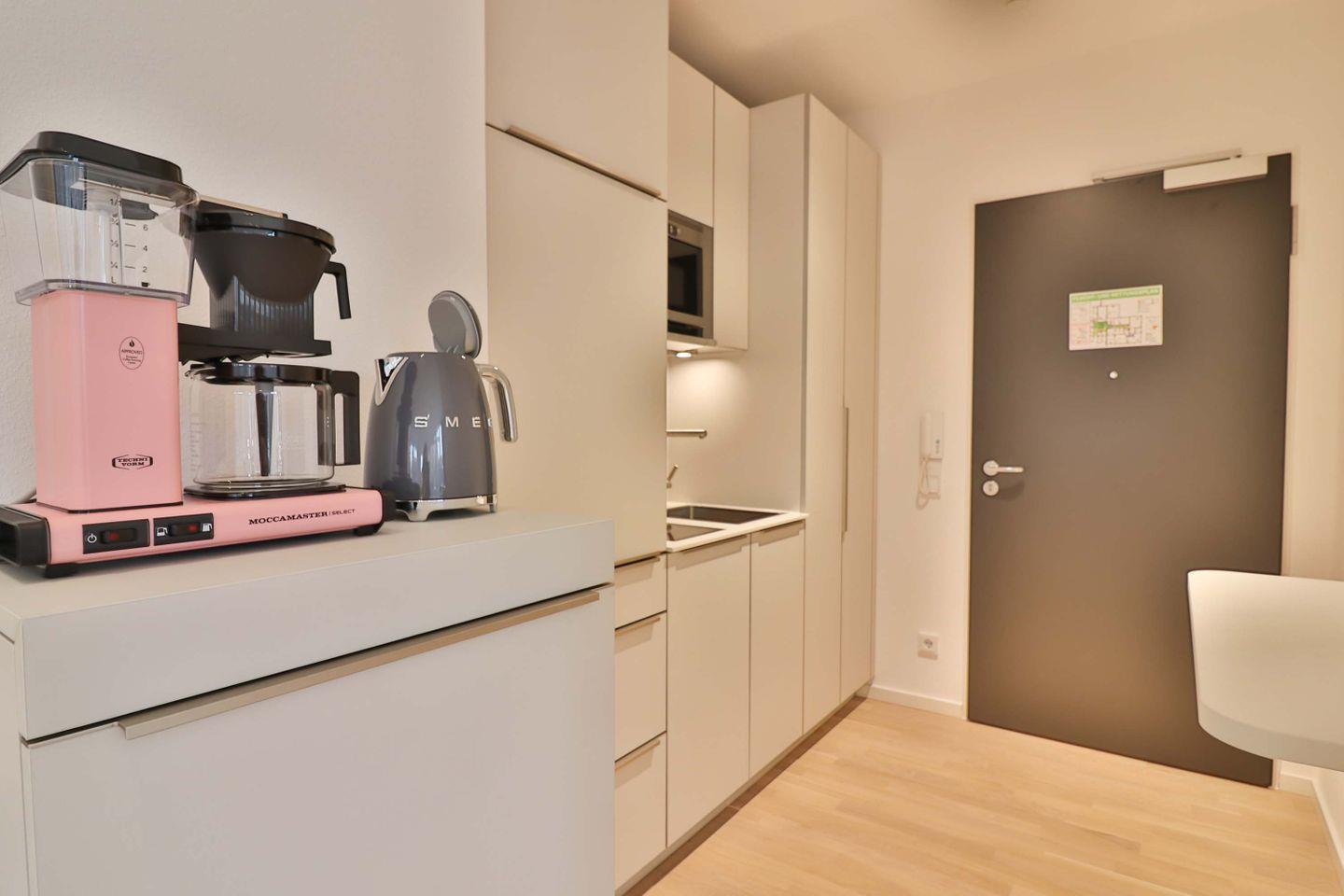 Im Eingangsbereich befindet sich die voll ausgestattete Küchenzeile mit einem 2-Platten-Induktionsherd, einer Spülmaschine, einer Mikrowelle, einem Kühlschrank mit Gefrierfach, einer Kaffeemaschine, einem Toaster und einem Wasserkocher.