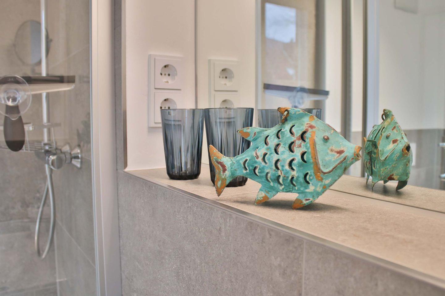 Neben dem Hauptraum finden Sie das Badezimmer. Es ist ausgestattet mit einer großen Dusche, einem WC, einem Haartrockner und einer Handtuchheizung. Eine Fußbodenheizung sorgt zusätzlich für eine angenehme Wärme nach der Dusche.