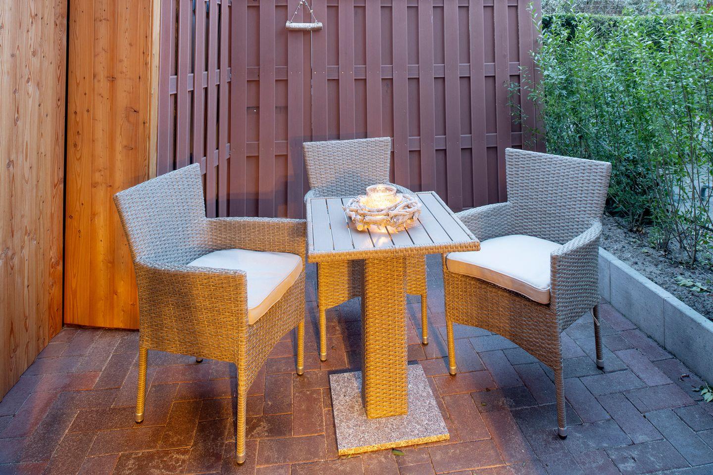 Diese Wohnung verfügt über eine Terrasse mit Sitzgruppe.