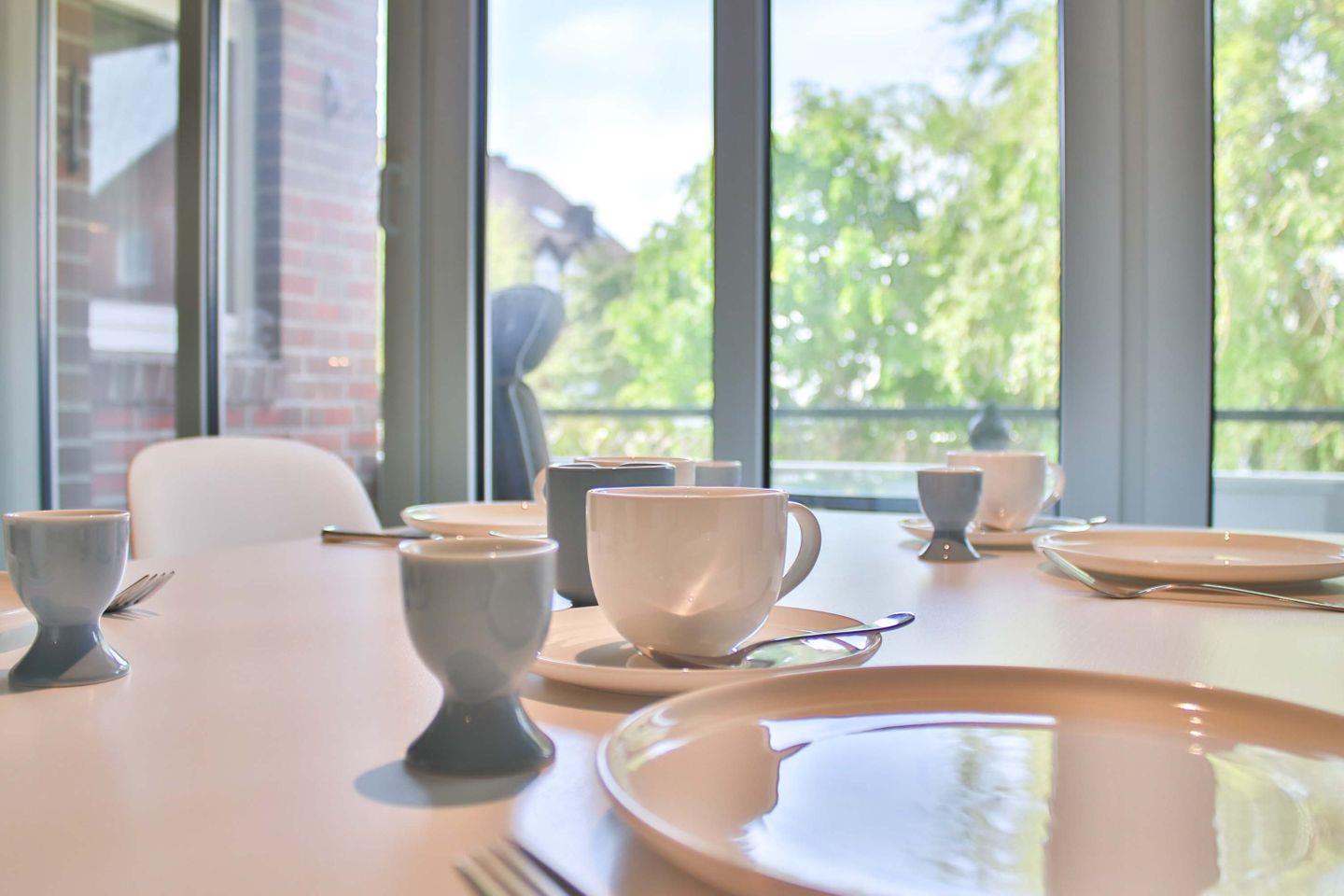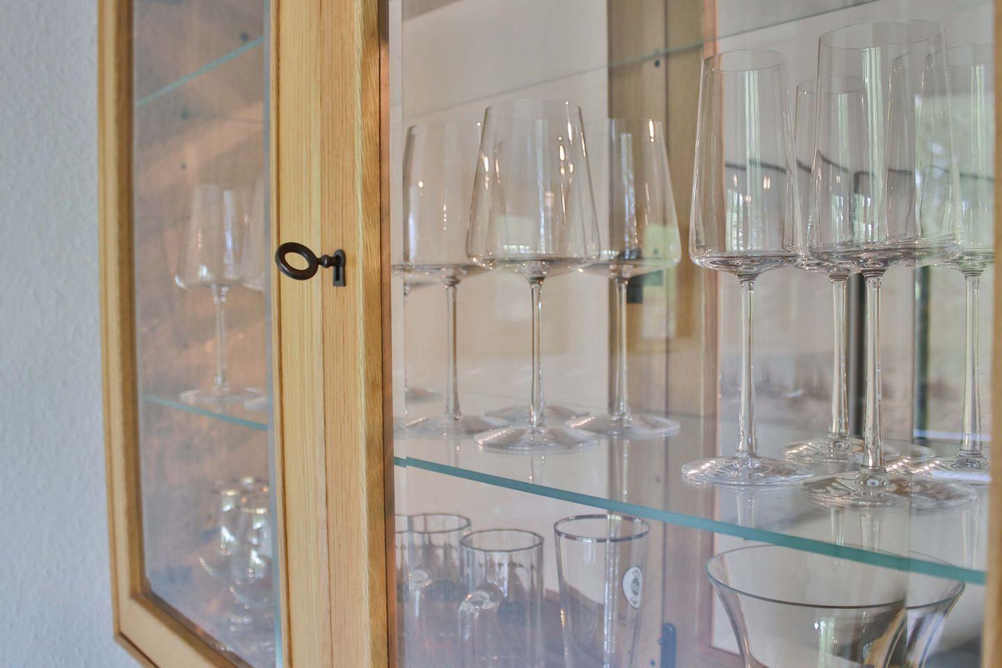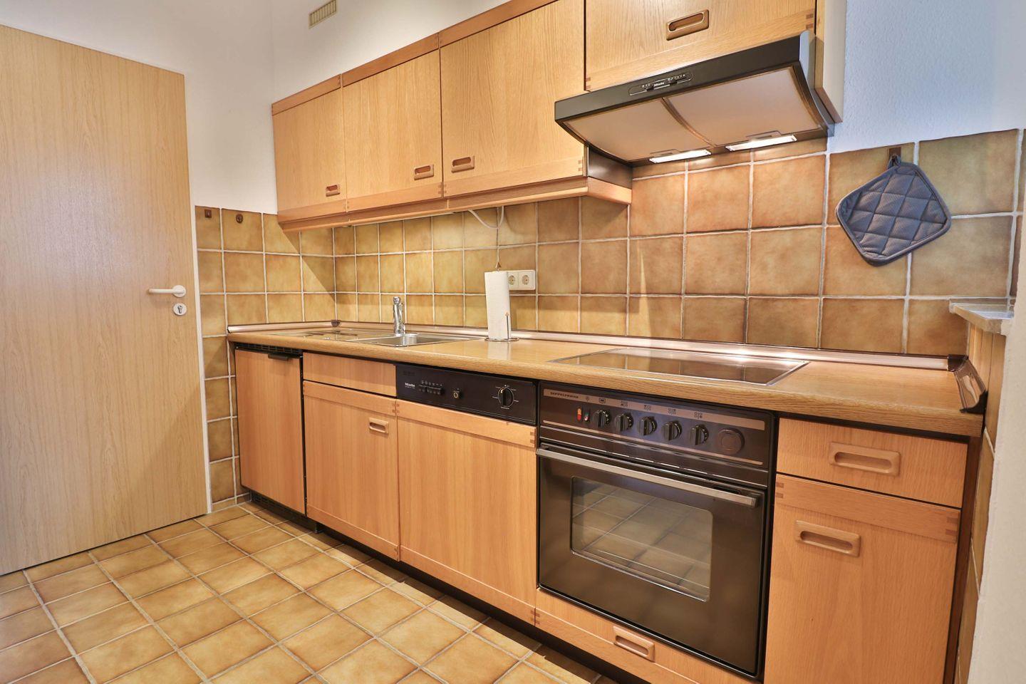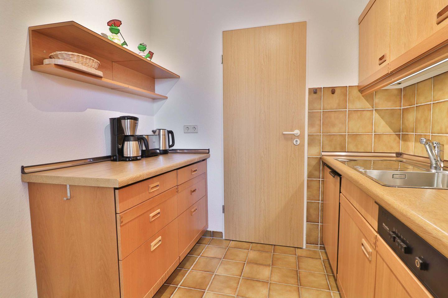 Angrenzend an den Wohnbereich befindet sich darüber hinaus die Küche. Sie ist mit allem ausgestattet, was Sie für Ihren Urlaub benötigen – 4-Platten-Ceranfeld, Backofen, Spülmaschine, Kühlschrank mit Gefrierfach, Filter-Kaffeemaschine, Wasserkocher und Toaster. Eine große Auswahl an Geschirr und Kochutensilien rundet das Angebot ab.