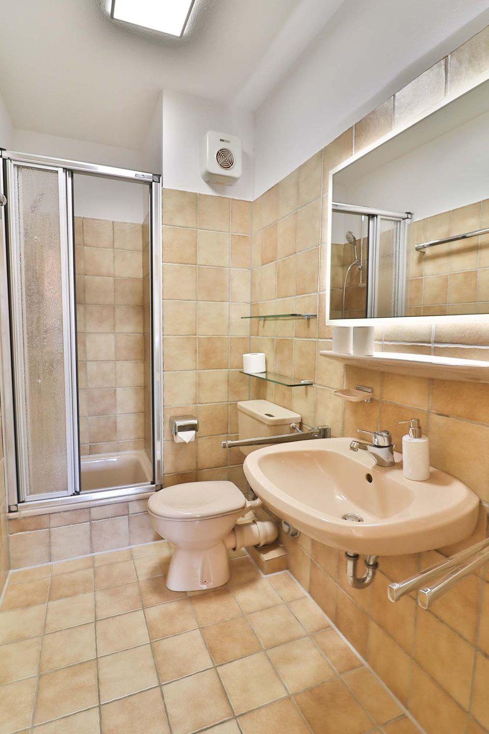 Das Badezimmer ist ausgestattet mit einer Dusche, einem Waschbecken und einem WC.
