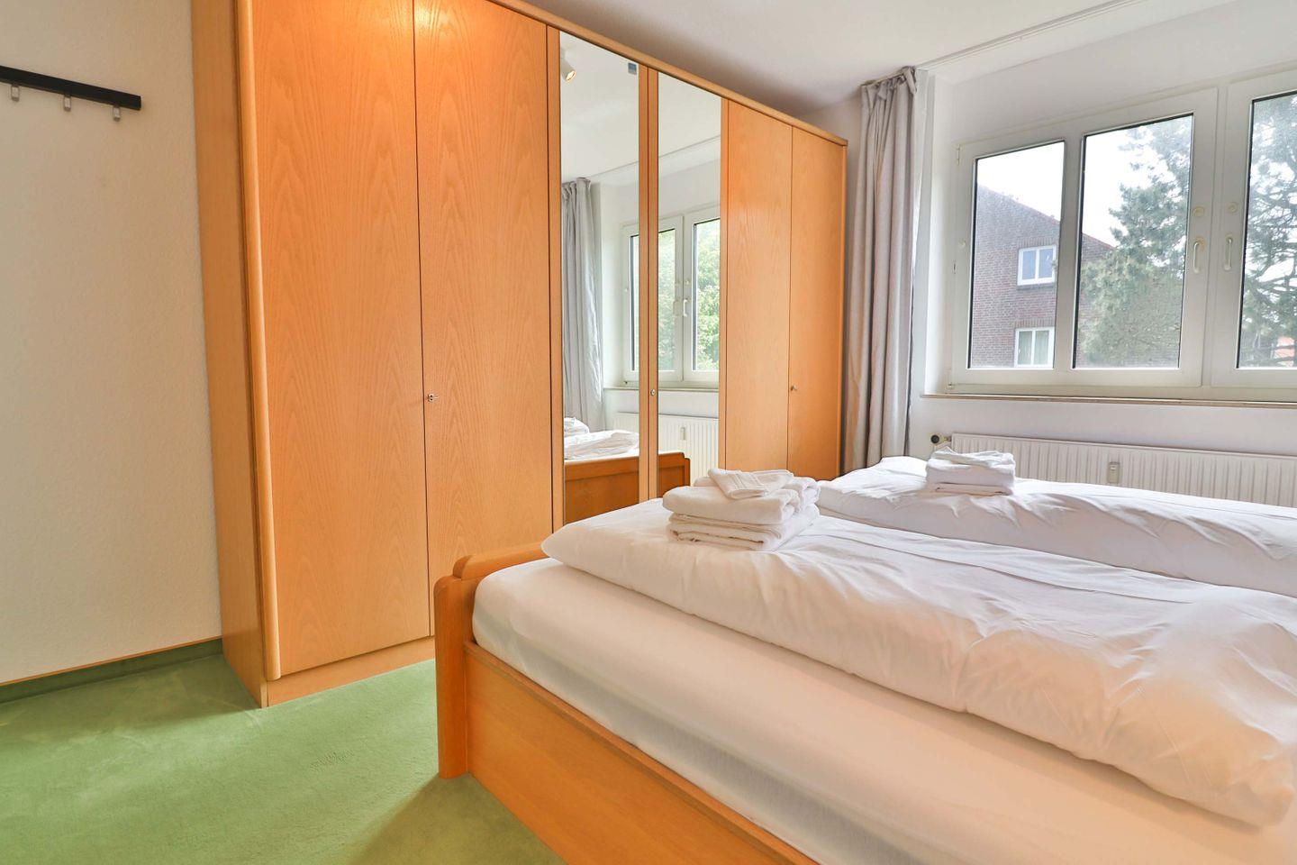 Das größere Schlafzimmer ist mit einem Doppelbett (200 x 200 cm) sowie einem großzügigen Kleiderschrank eingerichtet.