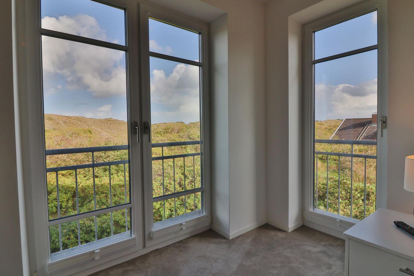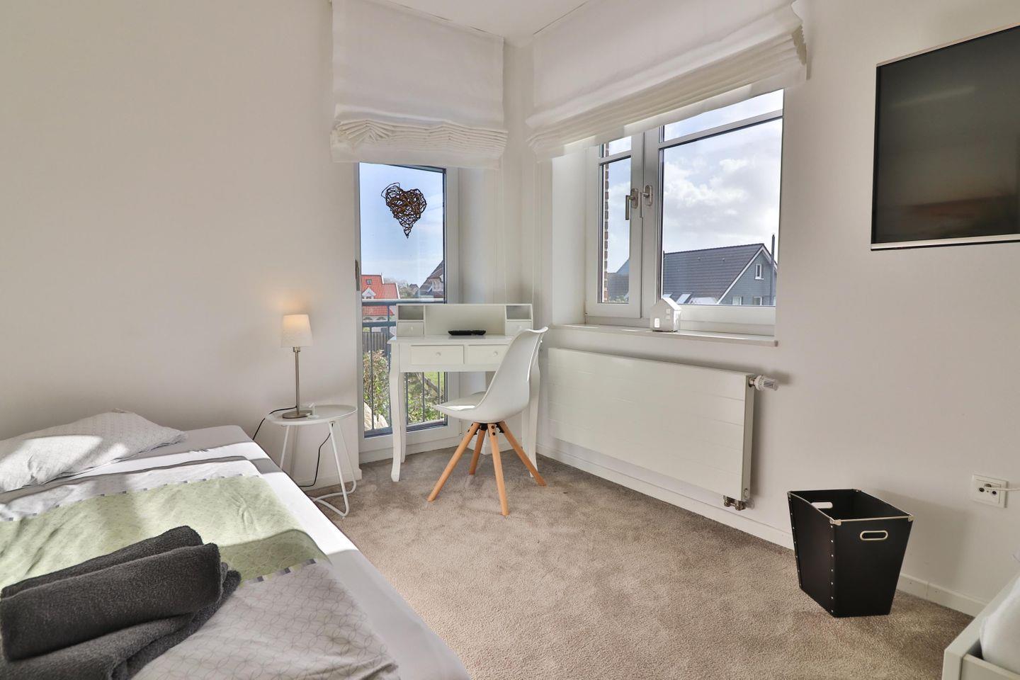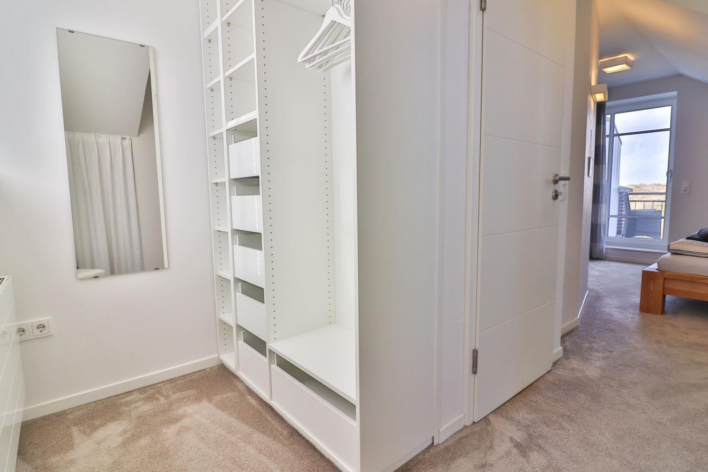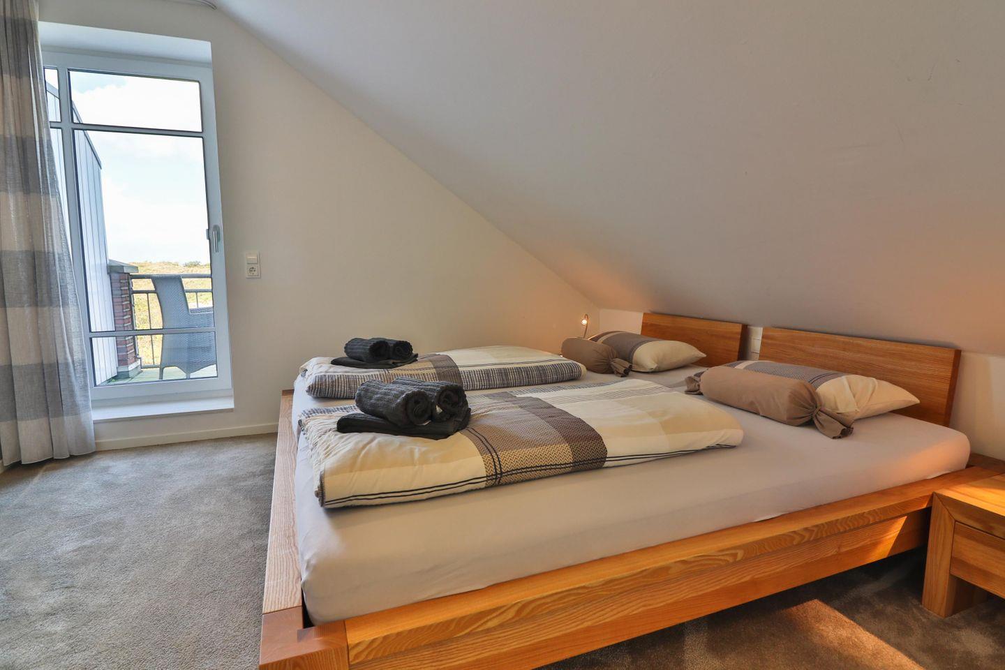 Eines der Highlights des Hauses ist zweifellos das Schlafzimmer im Dachgeschoss mit eigenem kleinen Bad mit Dusche. Dort erwartet Sie ein großes Doppelbett (200 x 200 cm) für ruhige Träume sowie ein eigener Balkon mit einem malerischen Ausblick in die umliegenden Dünen. Ein begehbarer Kleiderschrank bietet ausreichend Stauraum für Ihre Urlaubsgarderobe und sorgt für zusätzlichen Komfort. Eine Tür zum Treppenhaus sorgt für zusätzliche Privatsphäre.