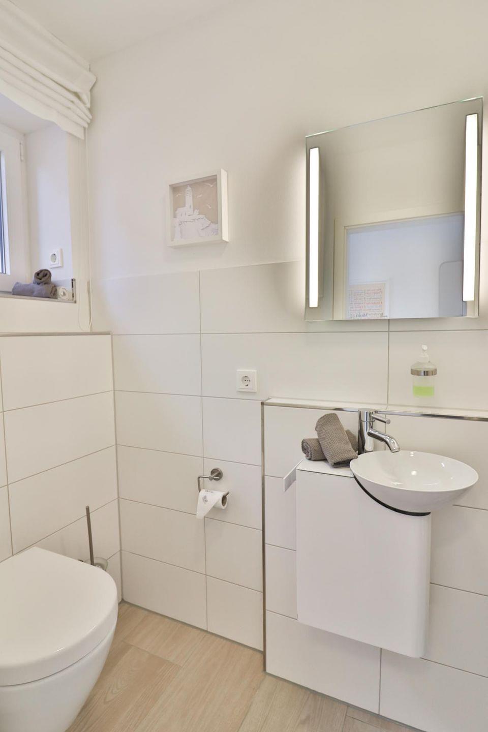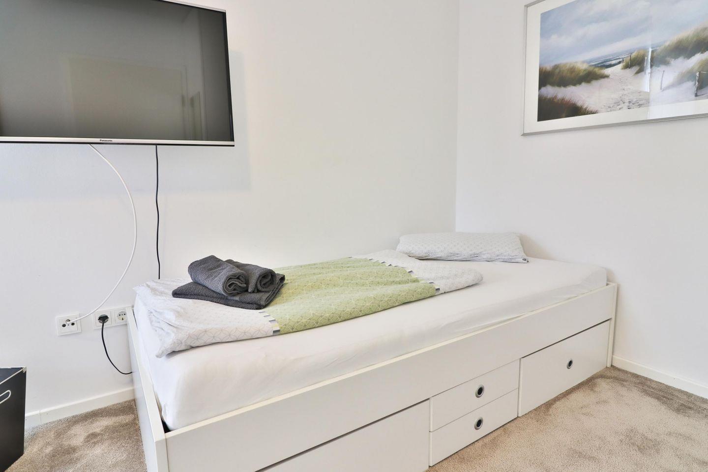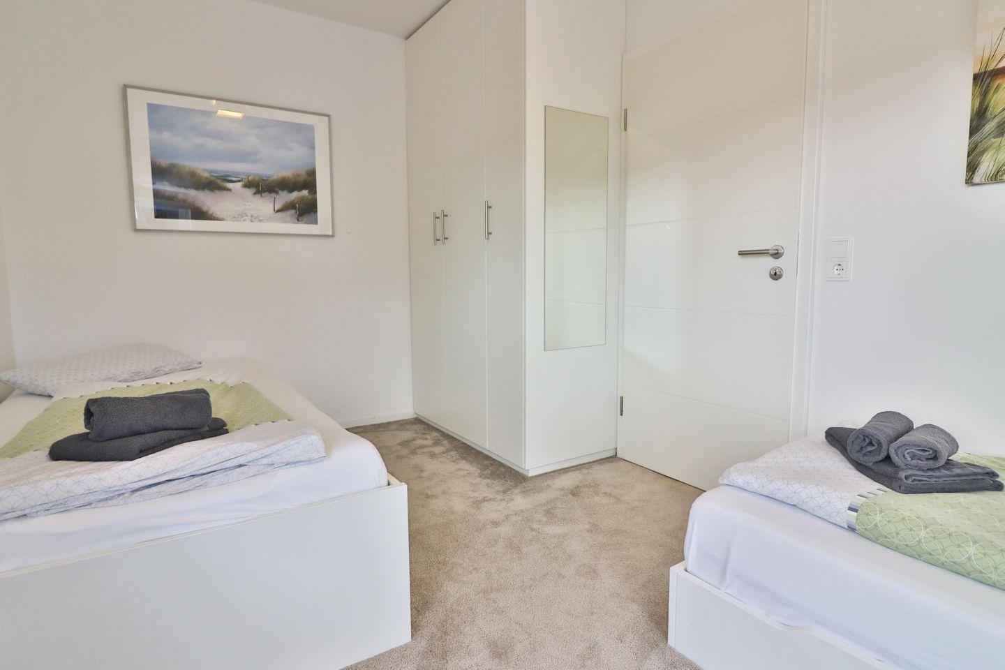 Auf drei Etagen finden Sie insgesamt drei gemütliche Schlafzimmer, zwei Badezimmer und ein Gäste-WC, sodass Sie und Ihre Lieben ausreichend Privatsphäre genießen können. Im Obergeschoss erwarten Sie zwei einladende Schlafzimmer – eines mit einem komfortablen Boxspringbett (180 x 200 cm), Fernseher und einem geräumigen Kleiderschrank sowie einer gemütlichen Sofaecke zum Entspannen. Das zweite Schlafzimmer ist mit zwei Einzelbetten (je ca. 90 x 200 cm), einem Fernseher und einem Schreibtisch ausgestattet – ideal für erholsame Nächte und Momente der Ruhe.