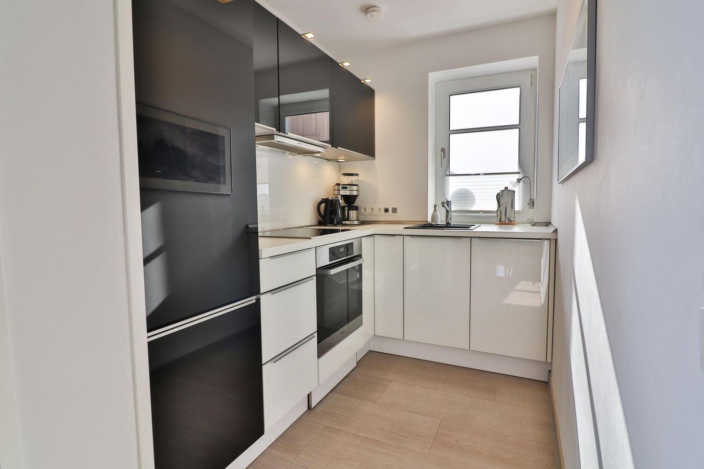 In der kleinen, zum Wohnzimmer offenen Küche, die keine Wünsche offen lässt, können Sie Ihrer kulinarischen Kreativität freien Lauf lassen. Ausgestattet mit einem Ceranfeld, Backofen, Spülmaschine, Kühl- und Gefrierschrank, Mikrowelle, Kaffeemaschine, Wasserkocher und einem Toaster wird das Zubereiten von Mahlzeiten zum Vergnügen.