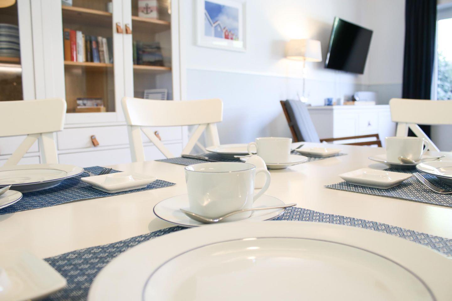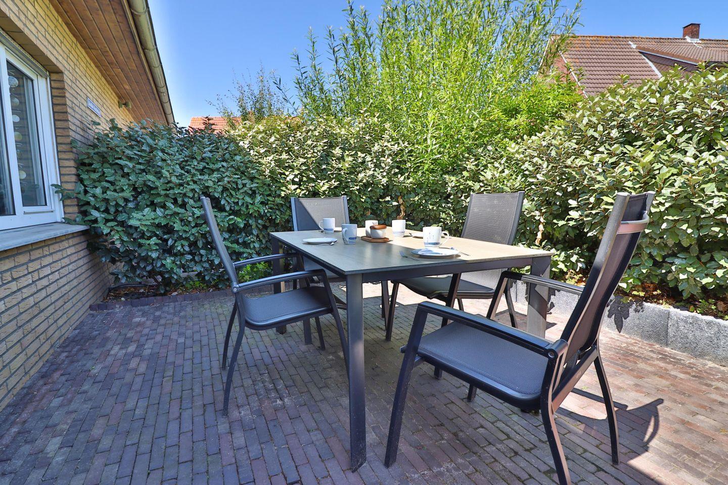 Besonderes Highlight ist die Terrasse der Ferienwohnung „Anker“! Hier können Sie sonnige Stunden im Freien verbringen und die frische Nordseeluft genießen. Ein Tisch mit Stühlen und ein komfortabler Strandkorb laden zu entspannten Momenten ein.