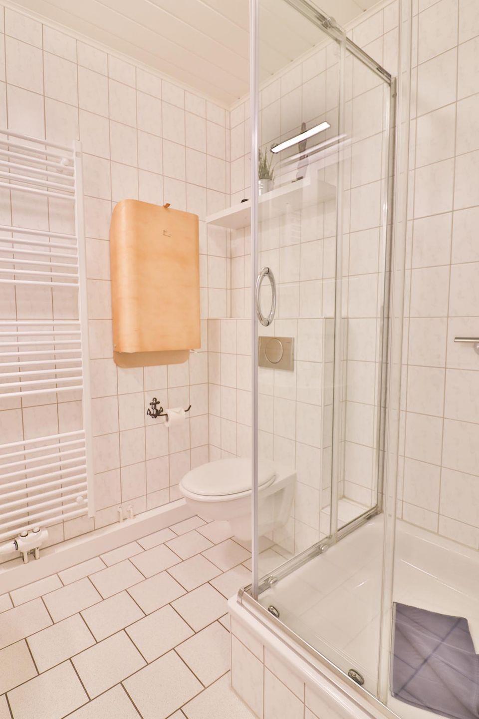 Das Badezimmer ist mit einer Dusche, einem WC und einem Waschbecken ausgestattet. Besonders praktisch ist der Wickeltisch zum Ausklappen, der speziell für Familien mit Kleinkindern gedacht ist.
