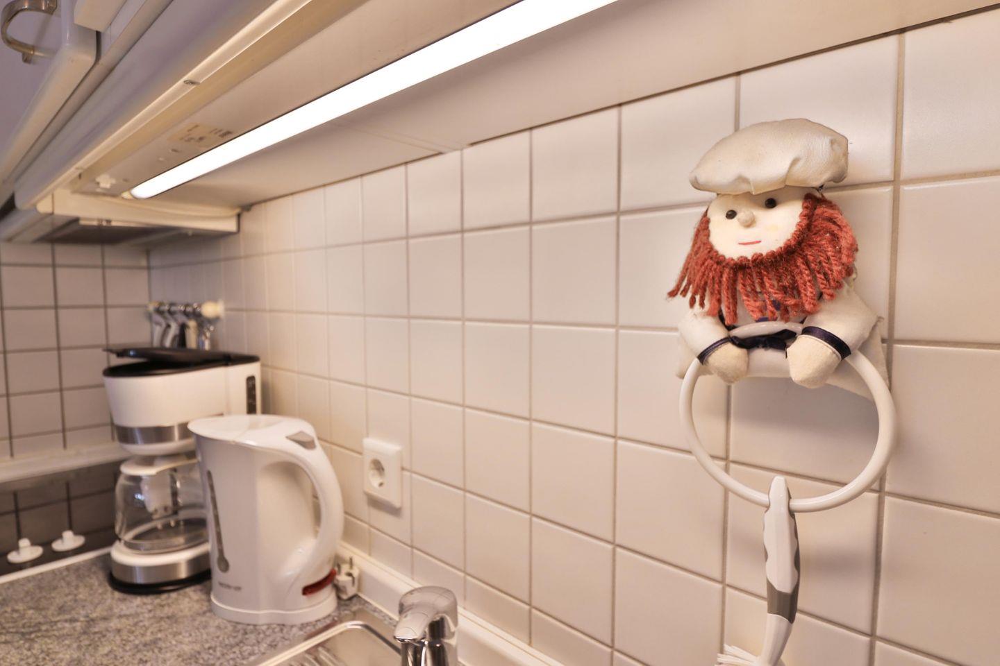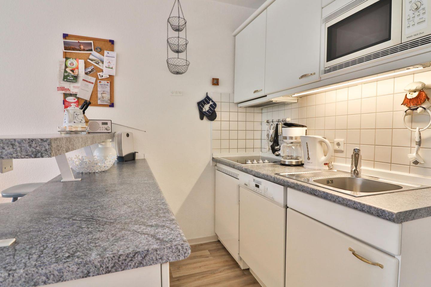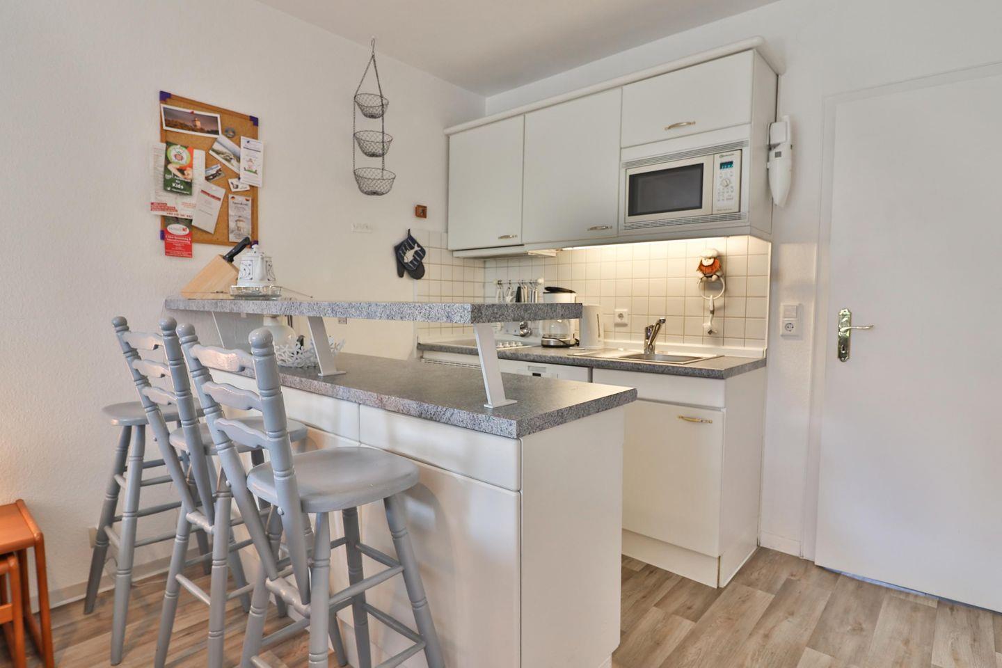 Der Wohn- und Essbereich lädt zu gemeinsamen Stunden ein. Die integrierte Küchenzeile bietet Ihnen alle Annehmlichkeiten, um köstliche Mahlzeiten zuzubereiten: Ein 4-Platten-Ceranfeld, eine Spülmaschine, eine Mikrowelle, eine Kaffeemaschine, ein Wasserkocher, ein Toaster sowie ein Kühlschrank mit Gefrierfach stehen Ihnen zur Verfügung. Die einladende Küchentheke ist der ideale Ort, um gesellige Abende zu verbringen und gemeinsam Ihre Lieblingsgerichte zu genießen.