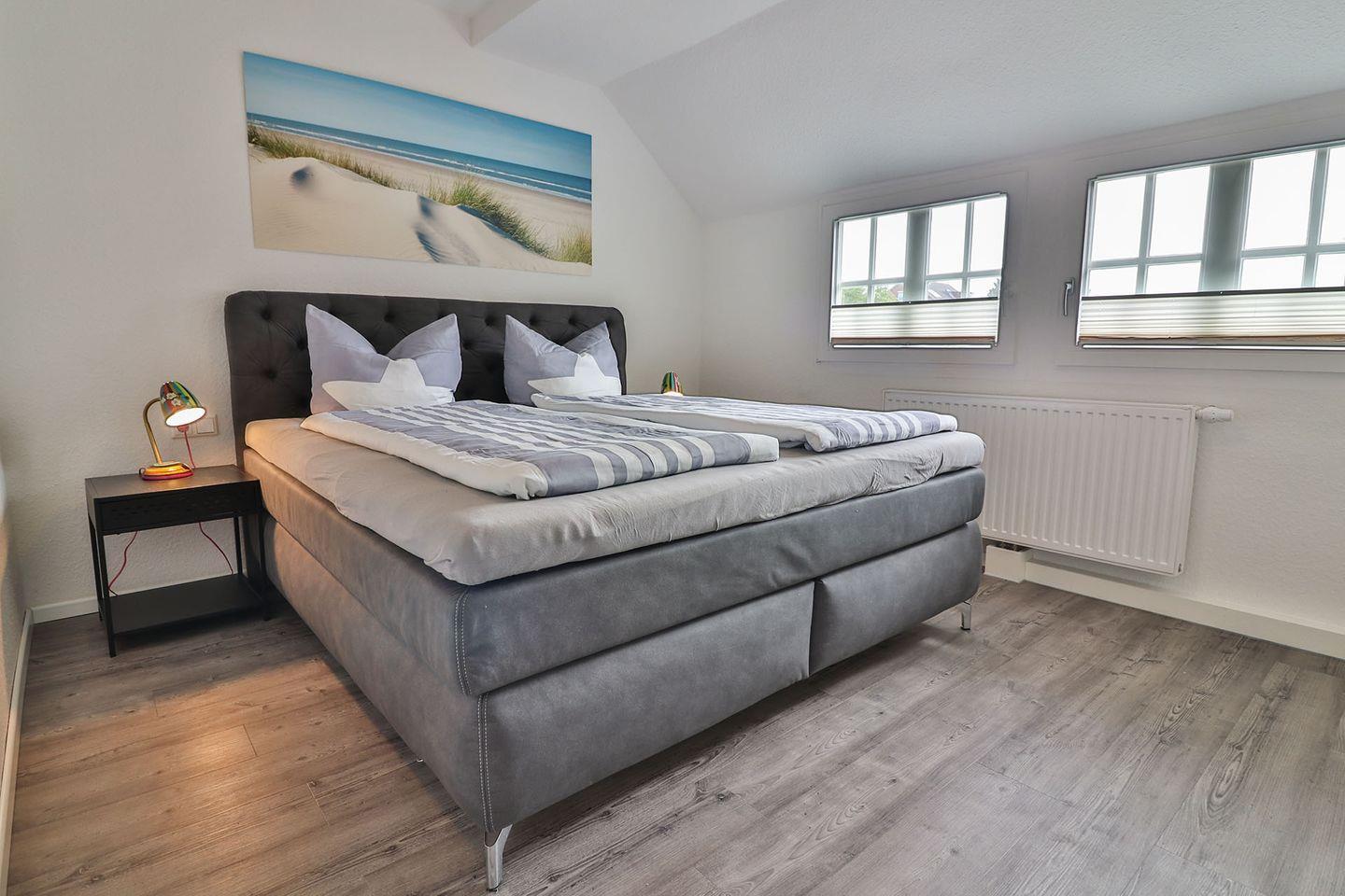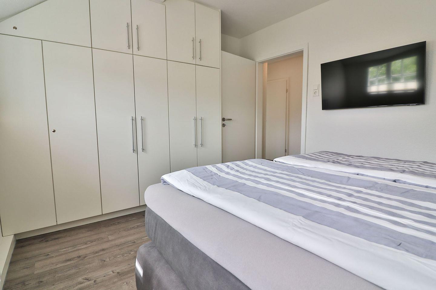 Das großzügige Schlafzimmer ist mit einem gemütlichen Boxspringbett (180 x 200 cm) ausgestattet, das Ihnen erholsame Nächte garantiert. Ein großer Kleiderschrank bietet ausreichend Platz für Ihre Garderobe. Zudem steht Ihnen ein moderner Fernseher zur Verfügung, sodass Sie den Tag entspannt ausklingen lassen können.