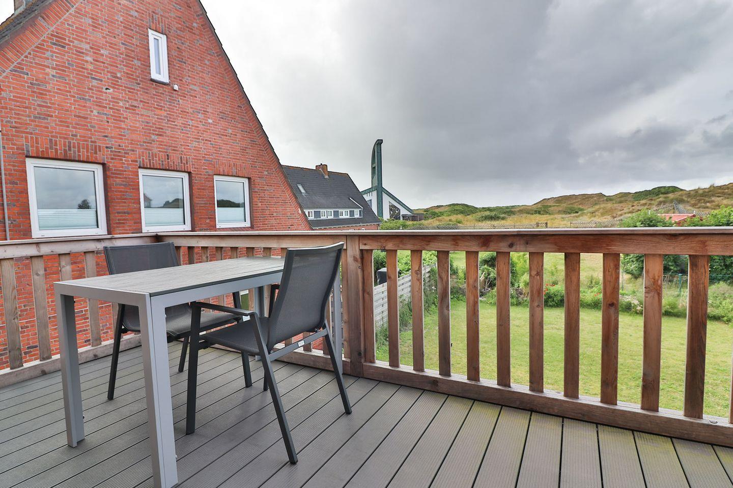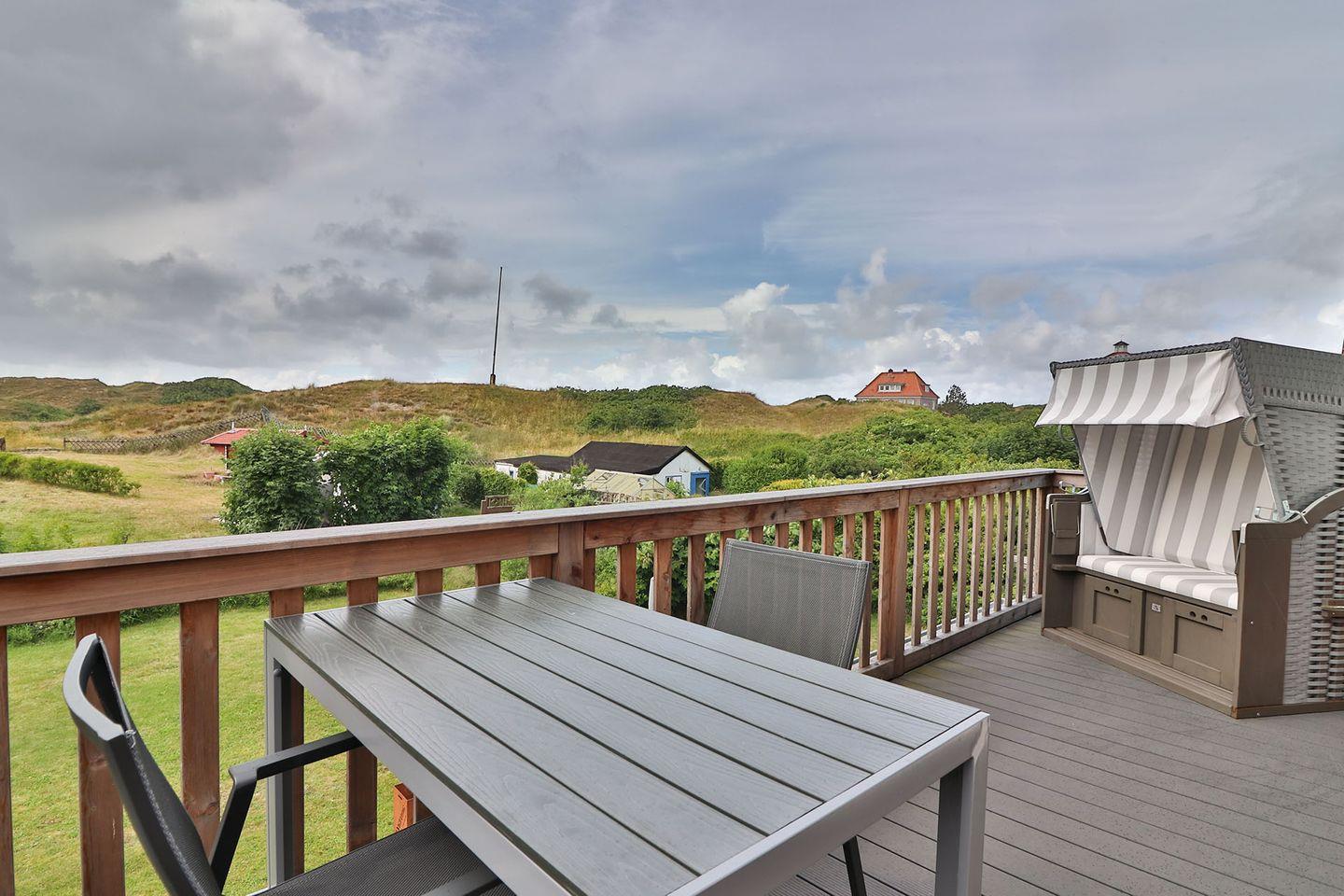 Ein besonderes Highlight der Wohnung ist der große Balkon, auf dem Sie im Strandkorb den traumhaften Ausblick in die umliegenden Dünen und auf den Wasserturm genießen können, das Wahrzeichen der Insel. Hier können Sie in völliger Ruhe und Privatsphäre Ihre Tage ausklingen lassen und die frische Meeresbrise einatmen. Je nach Windrichtung können Sie sogar das Meer rauschen hören.
