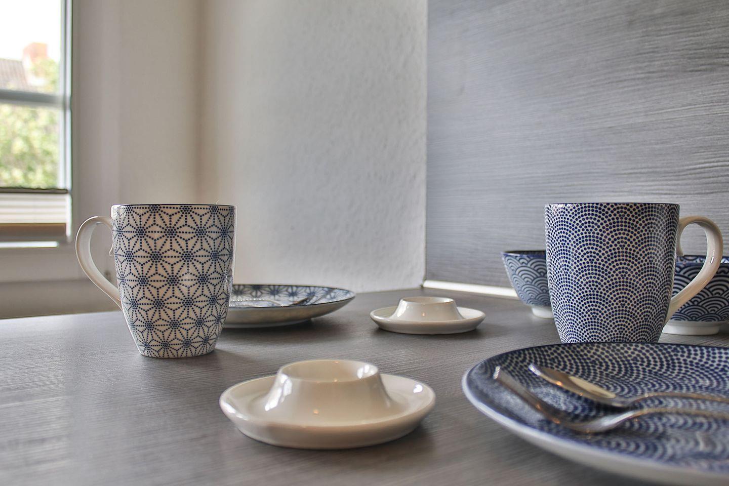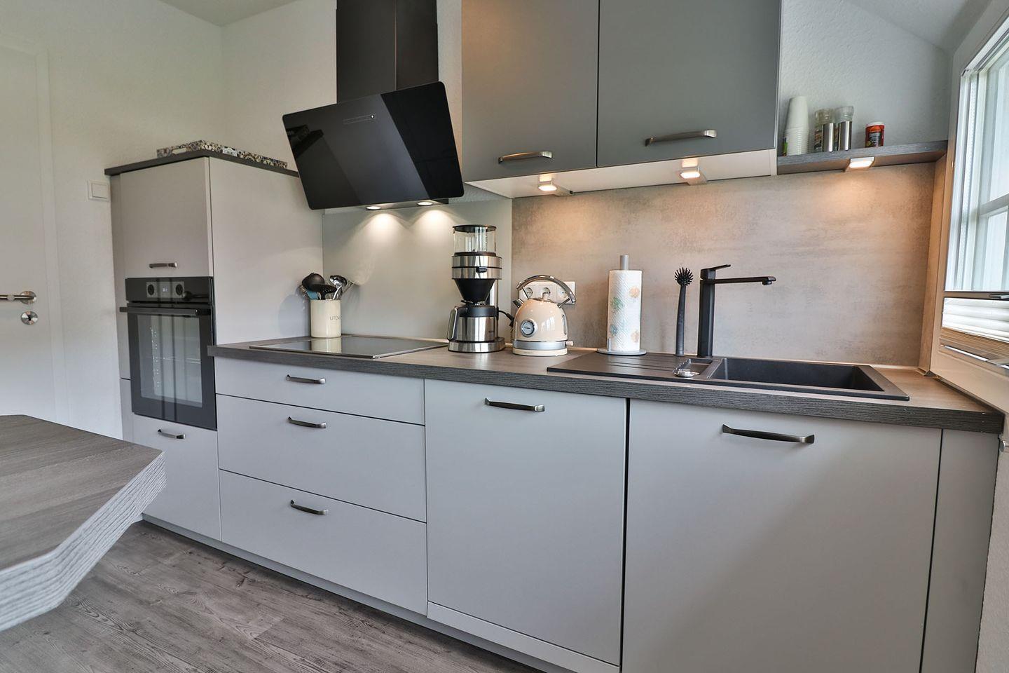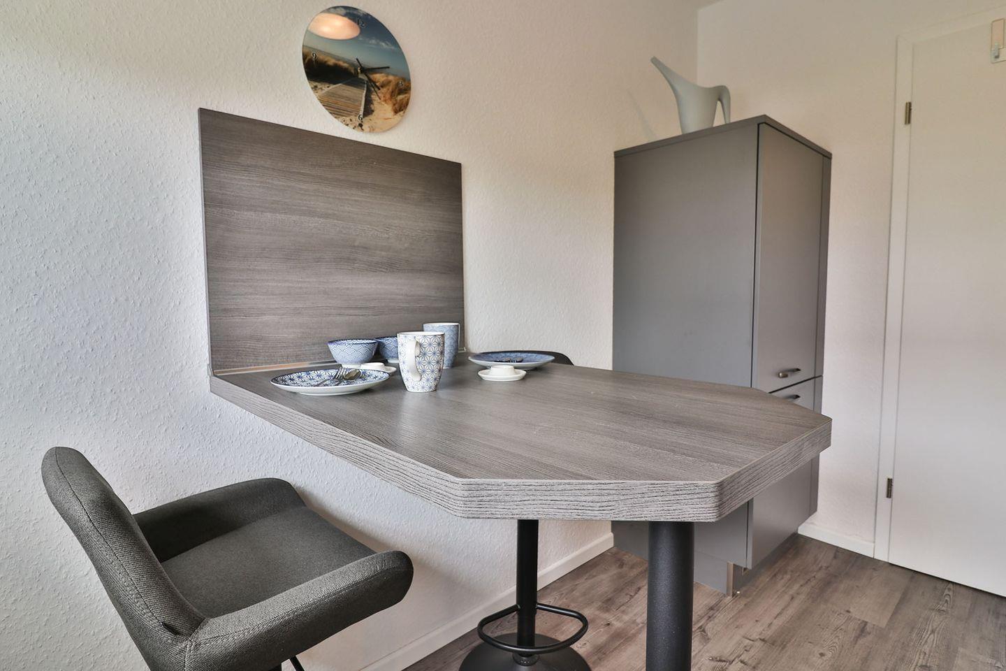Die voll ausgestattete Küche lässt keine Wünsche offen. Mit Induktionsfeld, Backofen, Spülmaschine, Kühlschrank mit Gefrierfach, Mikrowelle, Kaffeemaschine, Wasserkocher, Toaster, Eierkocher, Handmixer und Waffeleisen haben Sie alles, was Sie zum Kochen und Backen benötigen. Ein separater kleiner Tisch mit Barhockern lädt zu einem schnellen Frühstück oder einer Tasse Kaffee ein.