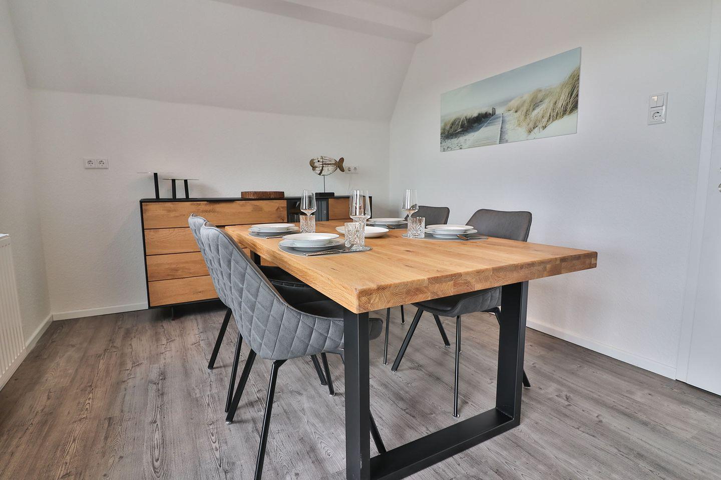Das Wohn- und Esszimmer lädt mit seinem gemütlichen Wohnbereich zum Verweilen ein. Zwei bequeme Sessel und ein Sofa bieten genügend Sitzmöglichkeiten für entspannte Abende vor dem Fernseher oder mit einem guten Buch. Der große Esstisch ist perfekt für gesellige Mahlzeiten oder gemütliche Spieleabende.