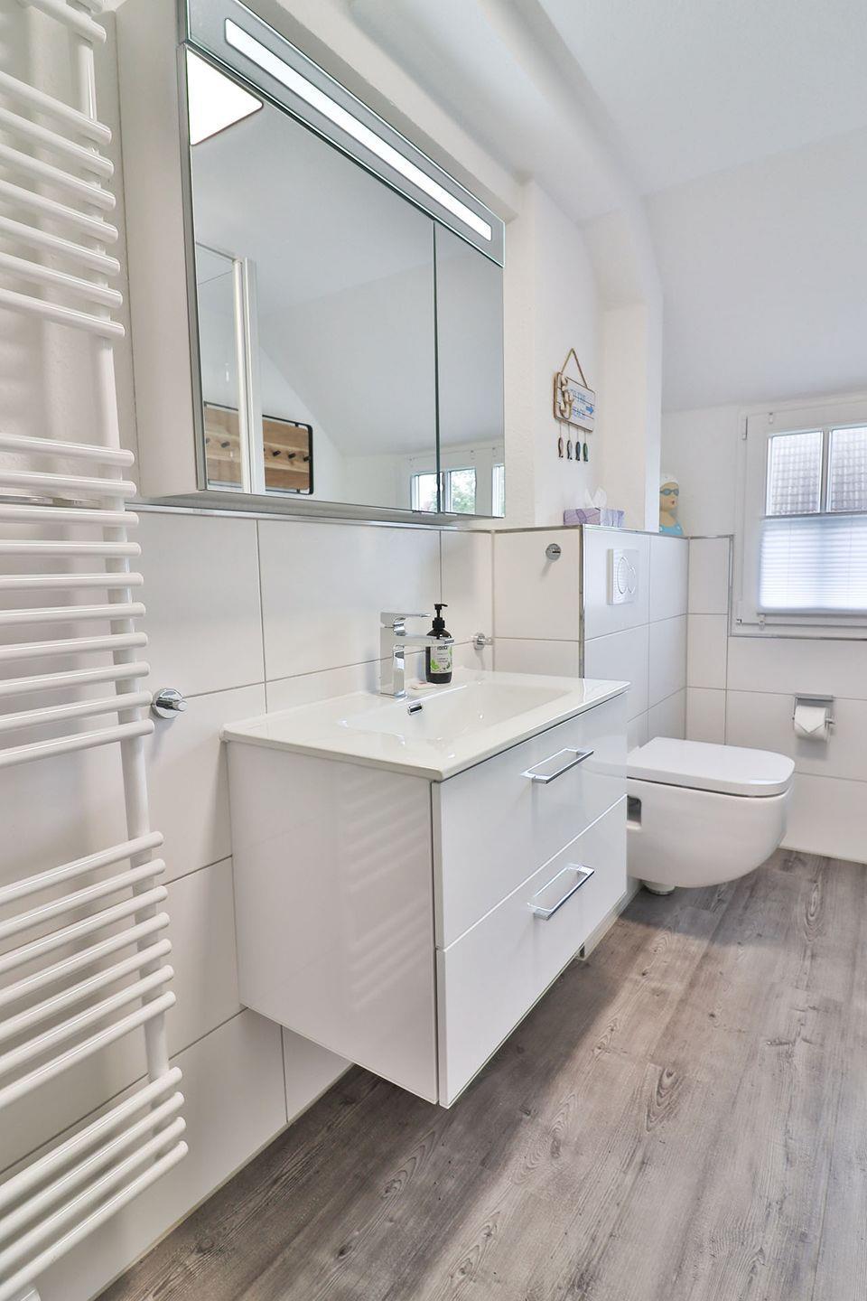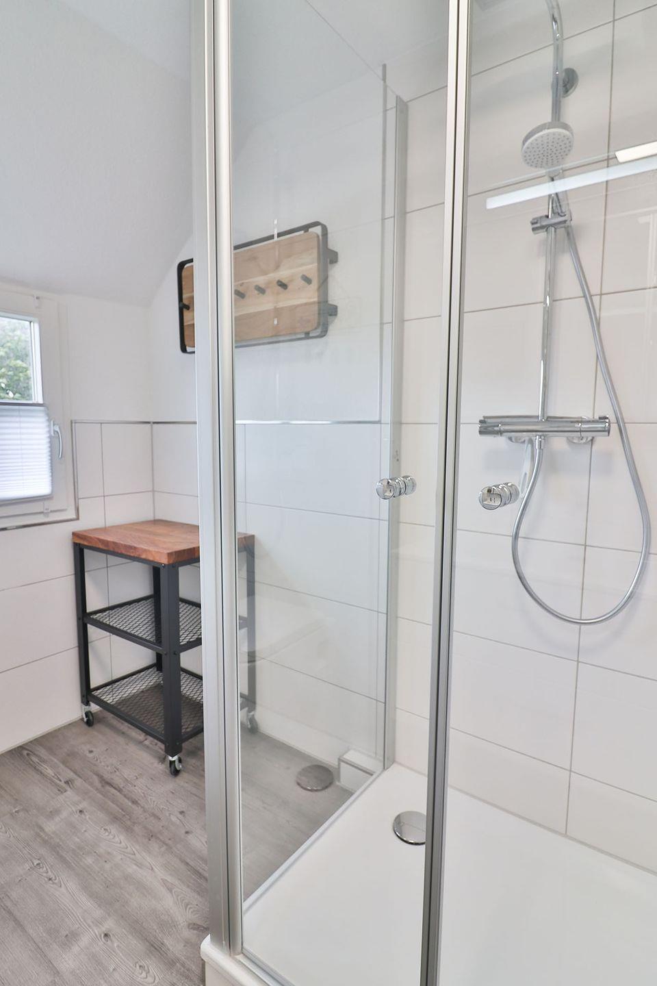 Das moderne Badezimmer ist mit einer Dusche, WC, Waschtisch, Fön und Handtuchheizung ausgestattet. Hier können Sie sich nach einem erlebnisreichen Tag auf der Insel erfrischen.