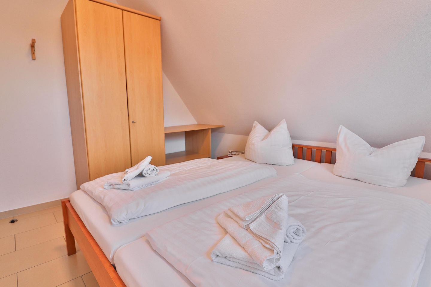 Diese Ferienwohnung verfügt über ein Hauptschlafzimmer mit einem komfortablen Doppelbett der Größe 180×200 cm, einem großen Kleiderschrank und praktischen USB-Steckdosen mit Leuchtfunktion zum einfachen Aufladen elektronischer Geräte. Das zweite Schlafzimmer ist mit zwei Einzelbetten der Größe 90×200 cm ausgestattet. Auch in diesem Zimmer steht Ihnen ein Kleiderschrank für Ihre persönlichen Gegenstände zur Verfügung sowie USB-Steckdosen mit Leuchtfunktion.