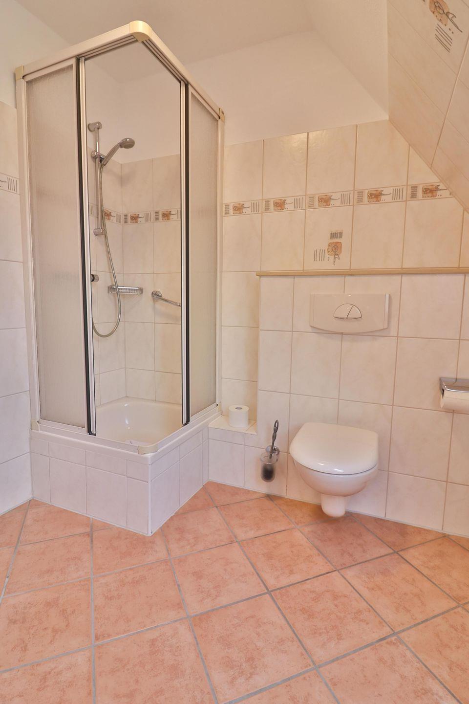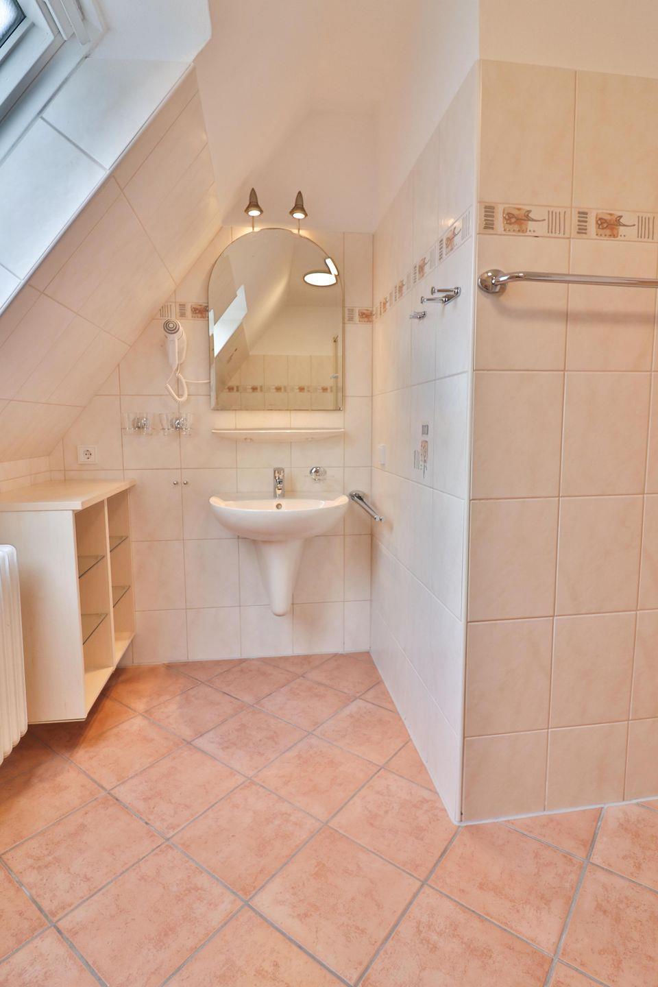 Das geräumige Badezimmer bietet eine Dusche, ein Waschbecken sowie ein WC. Hier finden Sie außerdem Kleiderhaken und ein zusätzliches Wandregal für Ihre persönlichen Utensilien. Auch ein Haartrockner ist hier vorhanden.
