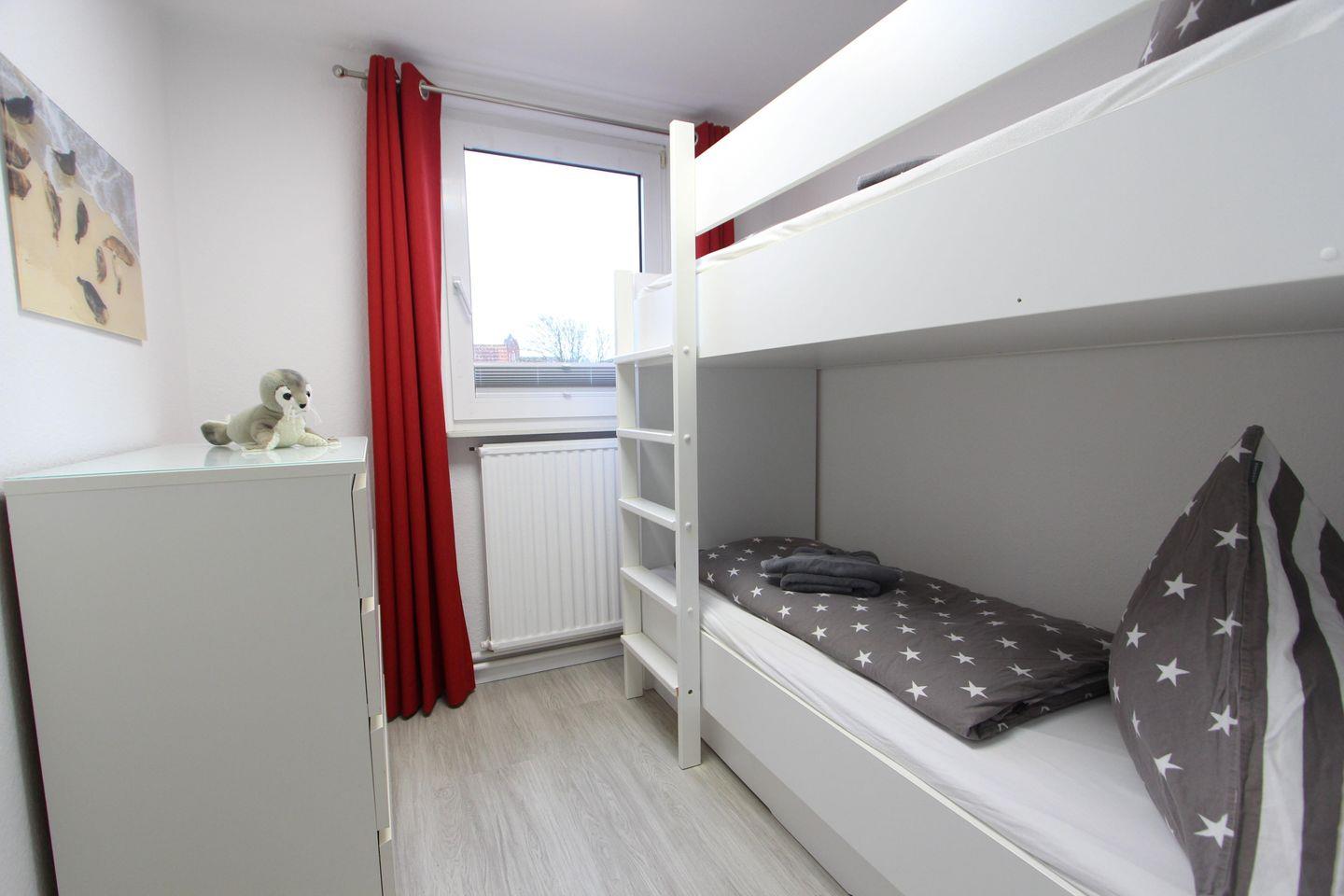 Obergeschosswohnung mit Schlafzimmer mit Doppelbett und Schlafzimmer mit Etagenbett