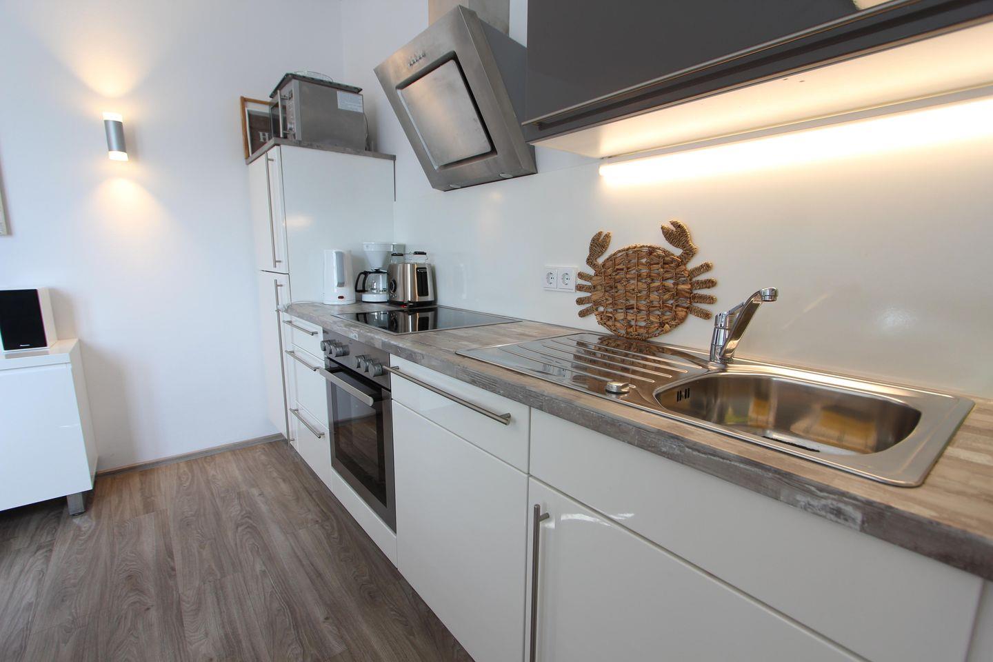 Wunderschöne, hochwertig ausgestattete Ferienwohnung, 40 m², mit Terrasse, eine Wohnküche mit Küchensofa und Flachbildfernseher, komplett ausgestatteter Einbauküche mit Cerankochfeld, Backofen und Geschirrspülmaschine, Toaster, Kaffeemaschine und Wasserkocher. Ein Schlafzimmer (Doppelbett mit TV-Flachbildschirm), modernes Bad mit Dusche und WC, Terrassenmöbel sind vorhanden.
