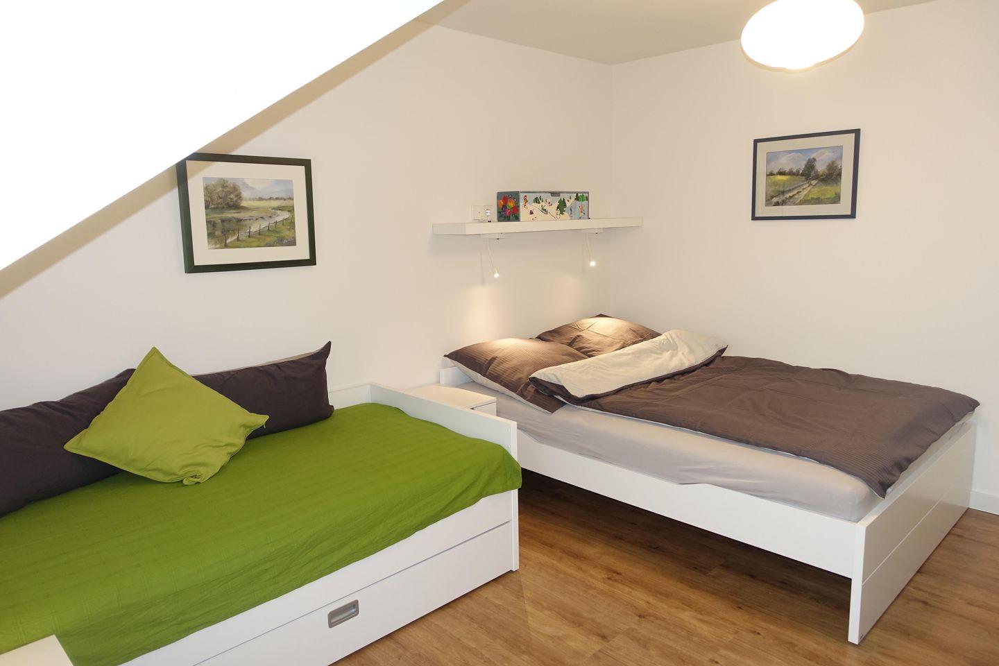 OG: Schlafzimmer (Doppelbett, TV), Schlafzimmer (Einzelbett 90 x 200 cm, Bett 140 x 200 cm), Badezimmer (Dusche, WC, Föhn) Kinderbett und Hochstuhl auf Anfrage, Verdunklung Rollläden, WLAN