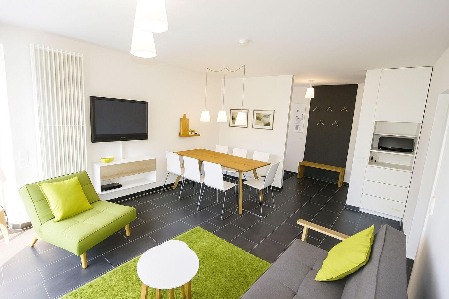 EG: Wohnraum mit Gaskamin, großem Flachbildschirm, Blu-Ray Player mit Streaming Funktion (u.a. Netflix, Amazon Video), Bluetooth Stereo-Micro-Anlage für MP3 CD mit USB-Anschluss und Radio, Esstisch für 8 Personen. Sofa mit Schlaffunktion für eine Person. Zugang zur Terrasse. Separate Küche mit Ausgang zur windgeschützten Terrasse. Ausgestattet mit Geschirrspüler, Ceranfeld, Backofen, Mikrowelle, großem Kühlschrank mit Gefrierschubladen, Kaffeemaschine, Pad-Kaffeemaschine, Wasserkocher, Toaster, Handmixer, Pürierstab.