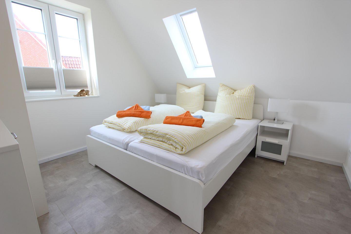 Beide Schlafzimmer verfügen über Doppelbetten mit den Maßen 180 cm x 200 cm, eines mit TV und eines mit Schreibtisch.