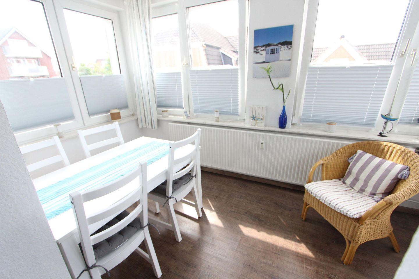 OG, ca. 40 m², geeignet für 2 Personen, mitten im Ortskern, sehr strandnahe Lage (innerhalb von 5 Minuten zu erreichen), 1 Wohnschlafraum (1 Doppelbett), komplett ausgestattete Einbauküche mit Geschirrspüler, heller Wohnraum mit bequemen Polstermöbeln, Kabel-TV, HiFi-Anlage, CD- und DVD-Player, an Wohnraum angrenzender, verglaster Erker mit gemütlichem Esstisch.