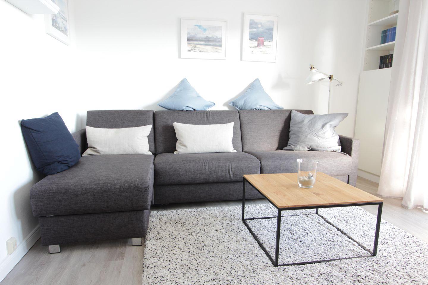 Auf ca. 34 m² verfügt die Wohnung über Platz für bis zu 4 Personen. Das Wohnzimmer ist mit Schlafcouch (Lattenrost), Liegefläche ca. 1,60 m x 2,00 m, Flat-TV mit Internet und Esstisch ausgestattet und bietet den Übergang auf den überdachten Balkon mit einladenden Möbeln.