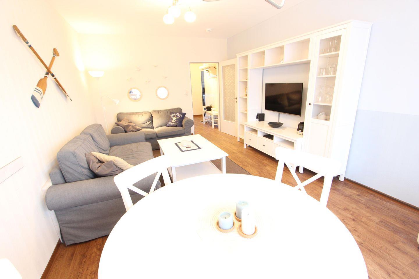 Im Wohnzimmer befindet sich ein großzügiger Esstisch und die gemütliche Couchecke mit einer Schlafcouch.
