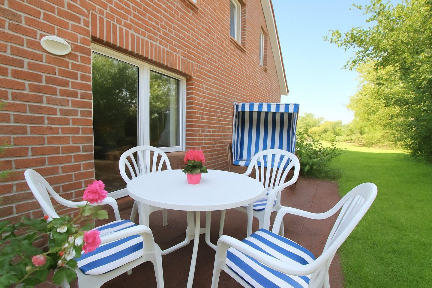 Eine liebevoll und modern eingerichtete Ferienwohnung (ca.45 qm): vom Wohnzimmer Zugang zur Terrasse mit Strandkorb und Garten.