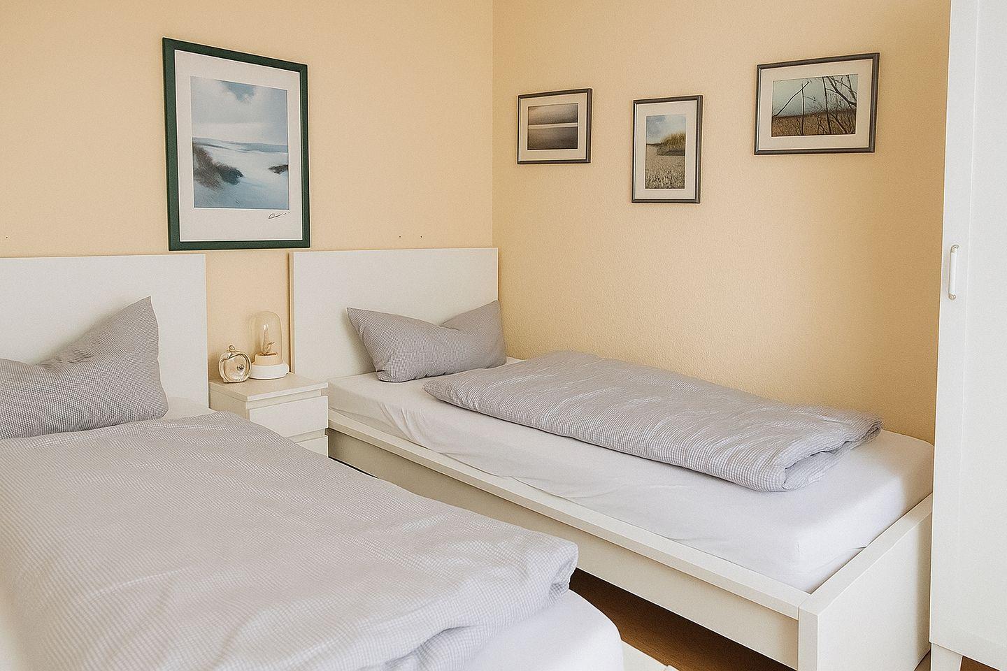 Die Wohnung befindet sich im ersten Obergeschoss und hat einen Balkon; Wohnzimmer mit Sitz- und Essecke, Flat-Screen-TV, DVD-Player, Stereoanlage; Küchenzeile mit Herd und Mini-Backofen; 1 Schlafzimmer mit 2 Einzelbetten; offener Zugang zwischen Wohn- und Schlafraum, Dusche/WC