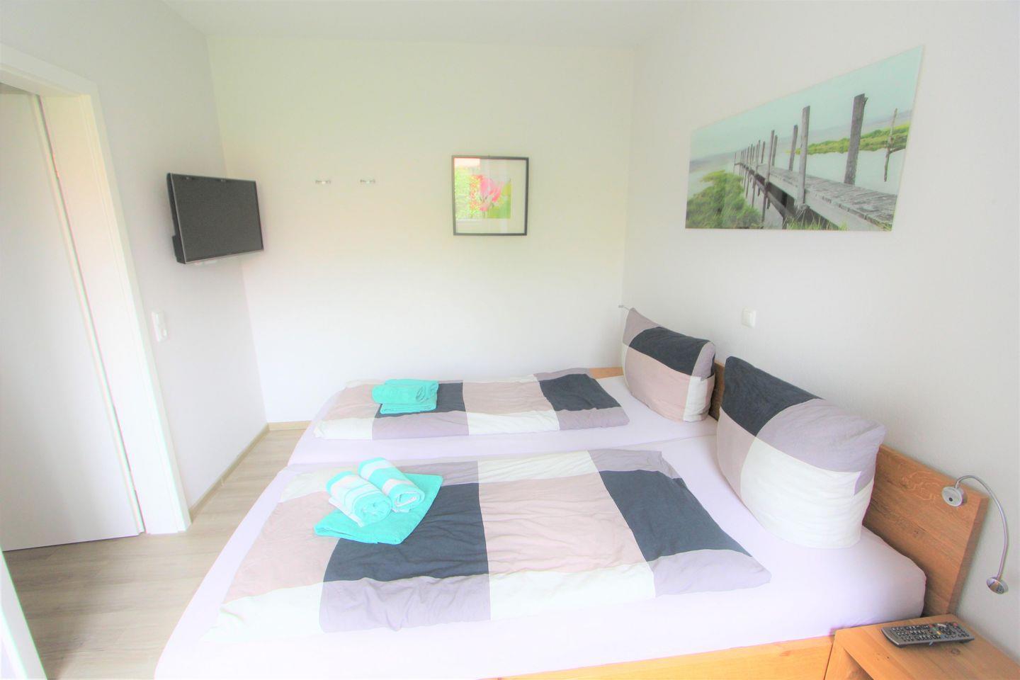 Hochwertig ausgestattete Ferienwohnung, 55 m², mit Gartenanteil und Terrasse, eine Wohnküche mit Essgelegenheiten. Wohnküche mit bequemer Couch und Flachbildfernseher, ausgestattete Einbauküche mit Cerankochfeld, Backofen und Geschirrspülmaschine, Kaffeemaschine und Wasserkocher. Ein Schlafzimmer (Doppelbett, mit TV-Flachbildschirm), ein Schlafzimmer mit einem weiteren Doppelbett, modernes Bad mit Dusche und WC, Terrassenmöbel mit Auflagen, Waschmaschine und Trockner im Keller vorhanden.