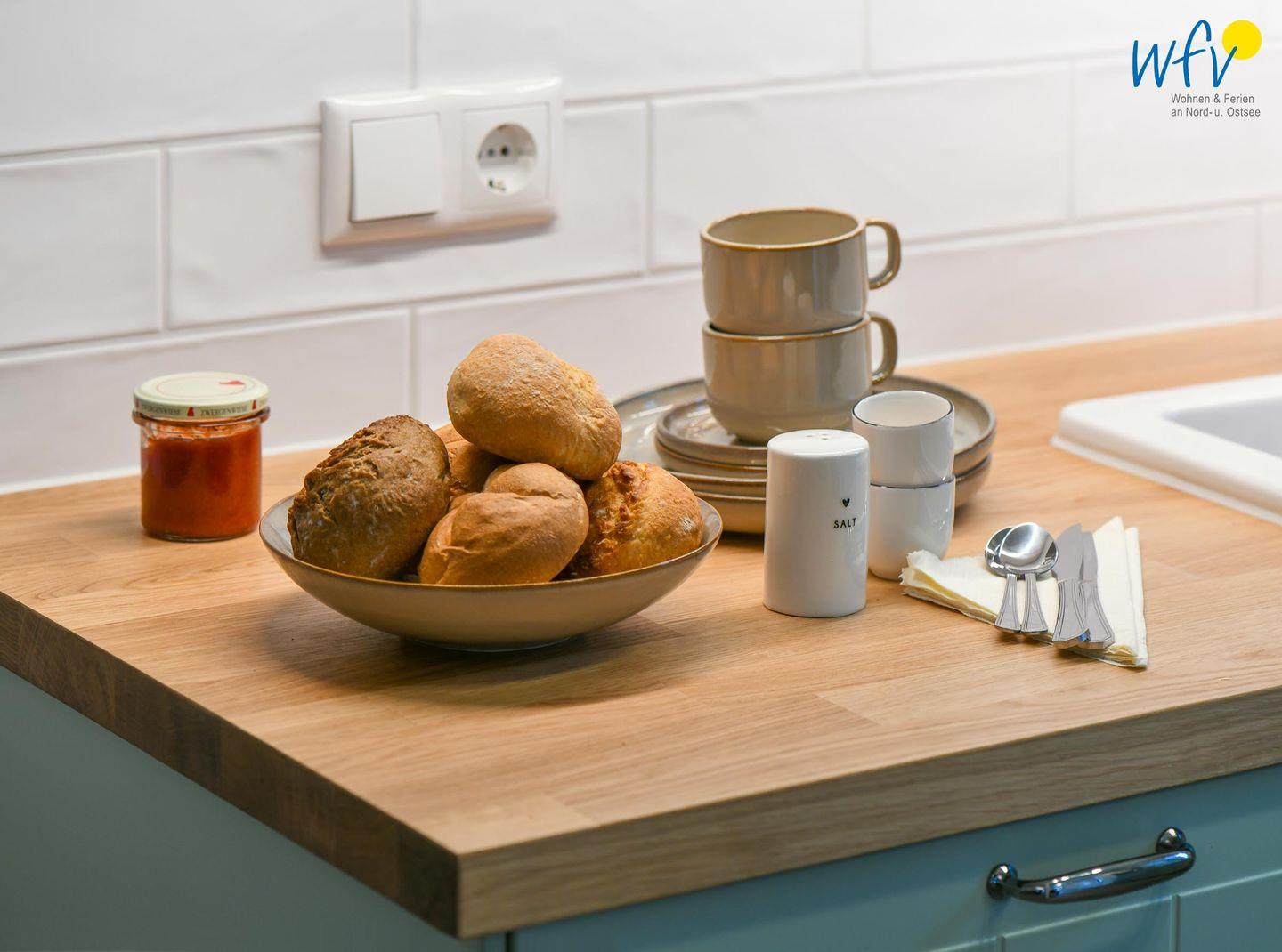 Die Ferienwohnung verfügt über ein modernes, offenes Wohnkonzept, das für ein weites Raumgefühl sorgt. Wohnbereich und Küche sind harmonisch miteinander verbunden, sodass Sie hier nach dem Strandtag oder der Fahrradtour gemütliche Abende auf dem bequemen Sofa verbringen, fernsehen und lesen können oder das gemeinsame Kochen genießen. Für kulinarische Erlebnisse ist die moderne Küche mit einem 4-Platten-Induktionsherd, einem Backofen, einer Mikrowelle, einem Kühlschrank sowie einer Spülmaschine ausgestattet. Der Essbereich mit breiter Fensterfront und schönem Lichteinfall lädt zu entspannten Mahlzeiten ein.