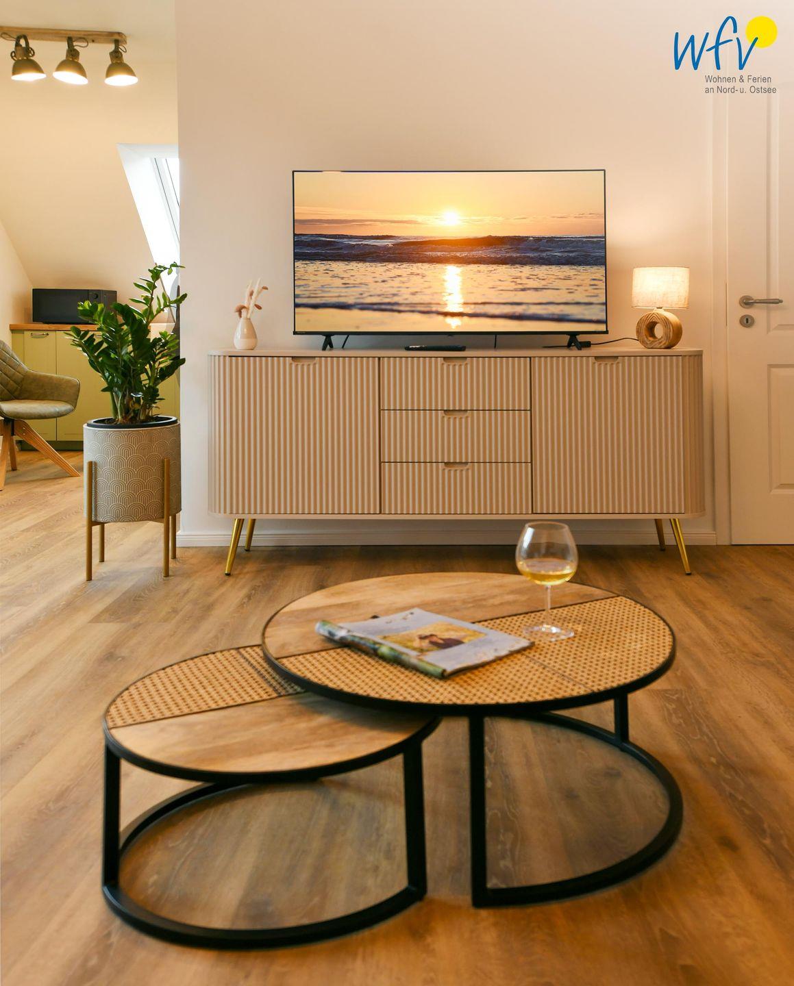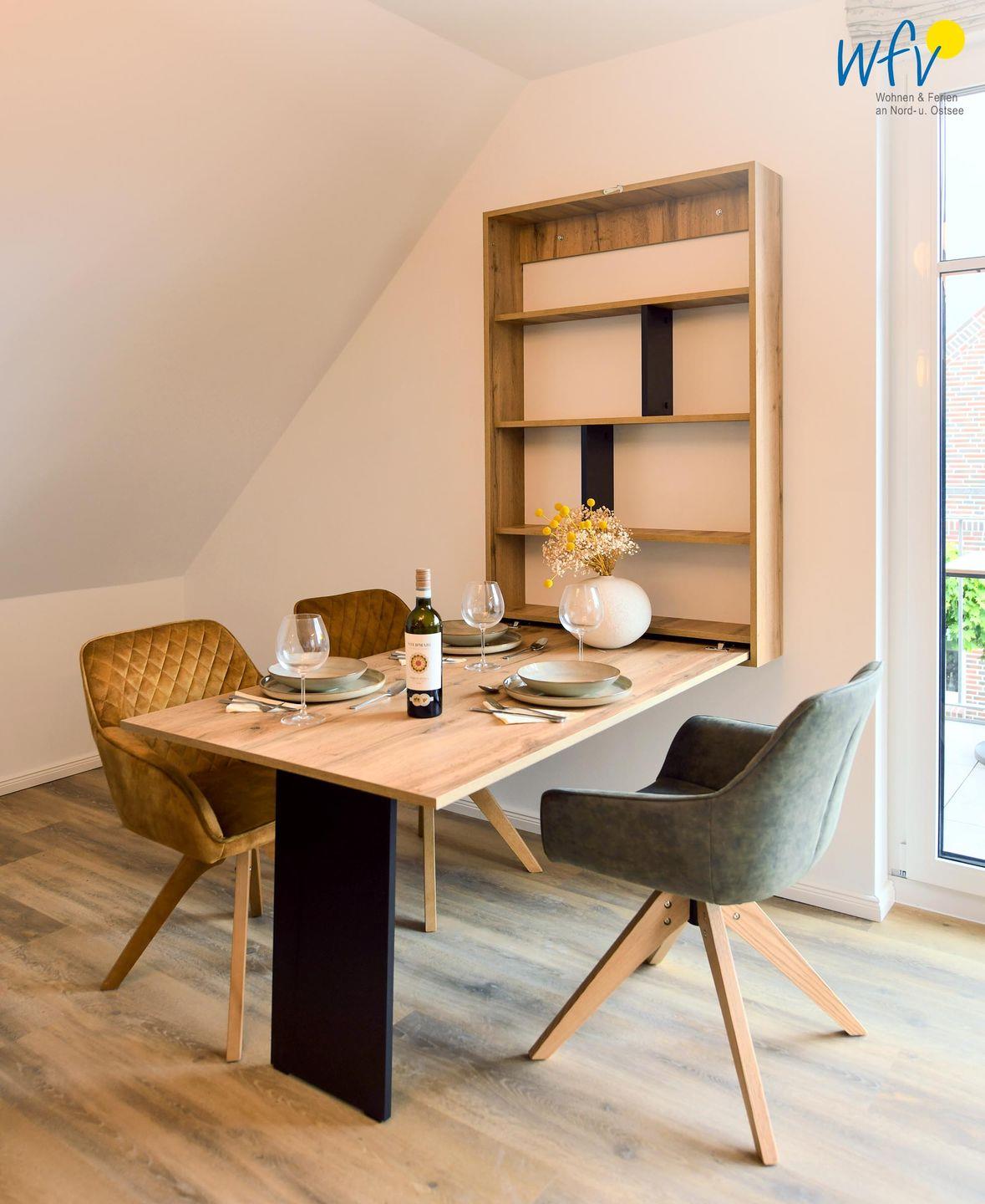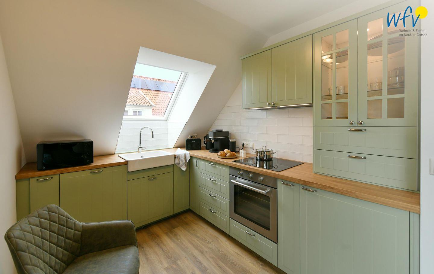 Die Maisonette-Ferienwohnung verfügt über ein modernes, offenes Wohnkonzept über zwei Etagen, das für ein weites Raumgefühl sorgt. Im Dachgeschoss sind Wohnbereich und Küche harmonisch miteinander verbunden, sodass Sie hier nach dem Strandtag oder der Fahrradtour gemütliche Abende auf dem bequemen Sofa verbringen, fernsehen und lesen können oder das gemeinsame Kochen genießen. Für kulinarische Erlebnisse ist die moderne Küche mit einem 4-Platten-Induktionsherd, einem Backofen, einer Mikrowelle, einem Kühlschrank mit Gefrierfach sowie einer Spülmaschine ausgestattet. Der angrenzende Wohnbereich lädt zu gemeinsamen Mahlzeiten ein.