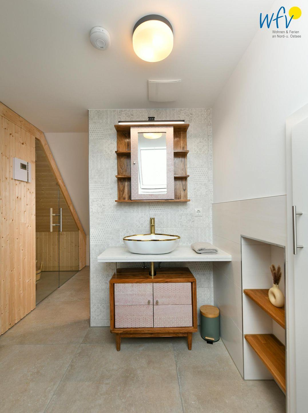 Ein Gäste-WC (DG) und ein elegantes Tageslichtbad im Spitzboden sorgen für angenehme Ausweichmöglichkeiten. In dem Tageslichtbad mit eigener Sauna und offenem Duschbereich genießen Sie wohltuende Entspannungszeit.