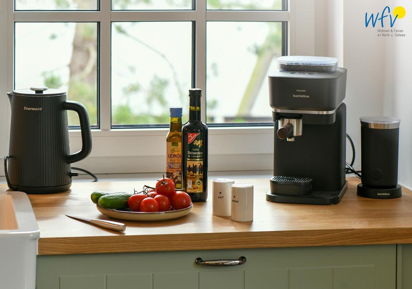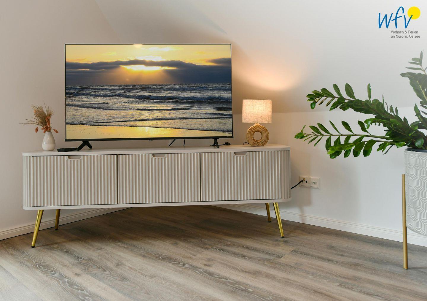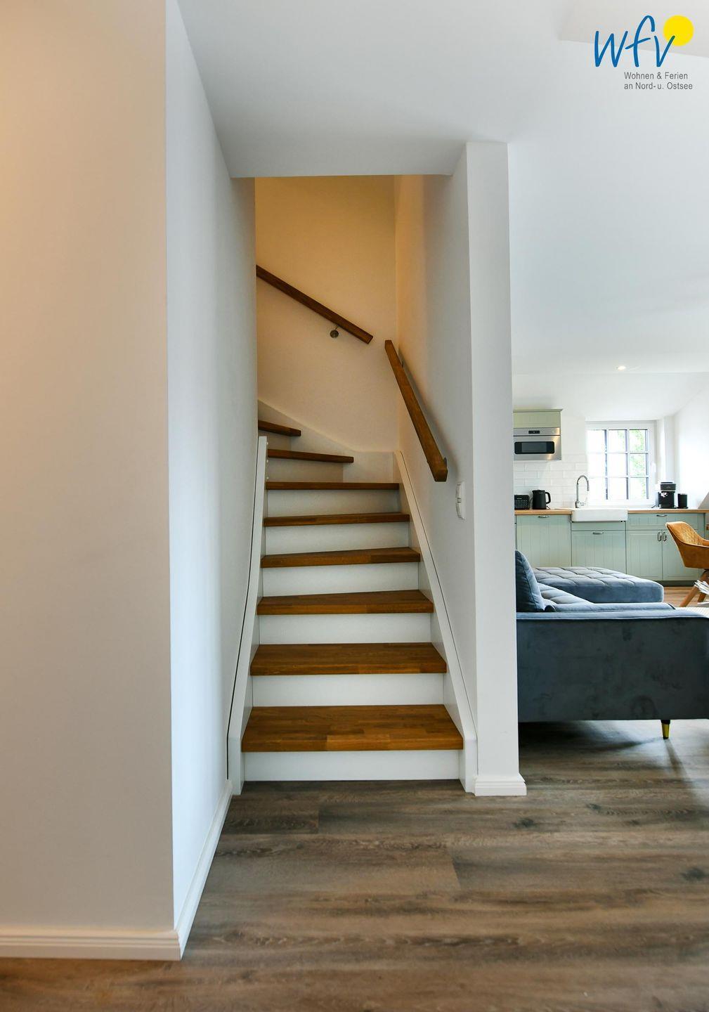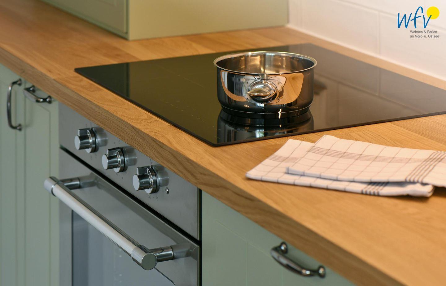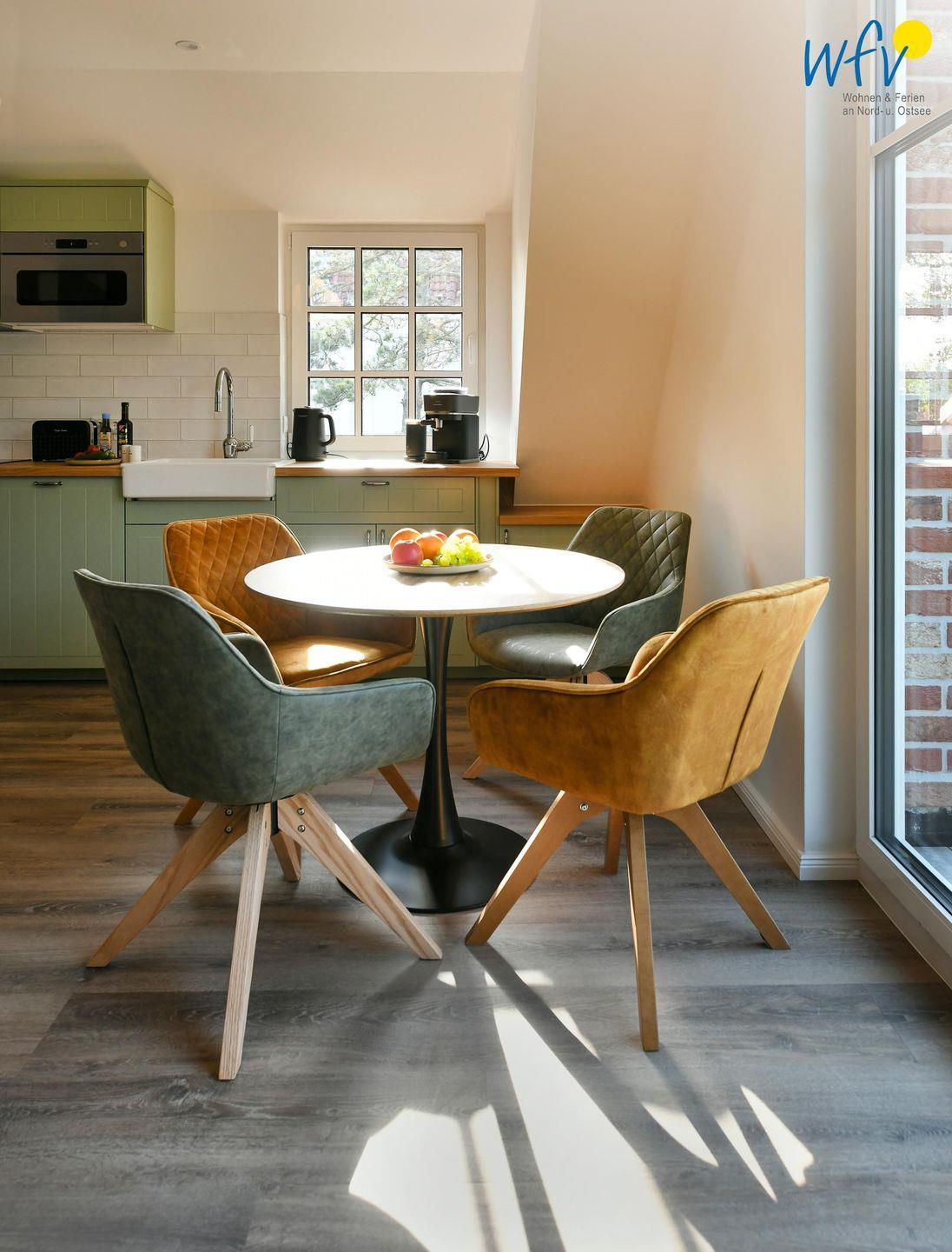 Die Maisonette-Ferienwohnung verfügt über ein modernes, offenes Wohnkonzept über zwei Etagen, das für ein weites Raumgefühl sorgt. Im Dachgeschoss sind Wohnbereich und Küche harmonisch miteinander verbunden, sodass Sie hier nach dem Strandtag oder der Fahrradtour gemütliche Abende auf dem bequemen Sofa verbringen, fernsehen und lesen können oder das gemeinsame Kochen genießen. Für kulinarische Erlebnisse ist die moderne Küche mit einem 4-Platten-Induktionsherd, einem Backofen, einer Mikrowelle, einem Kühlschrank mit Gefrierfach sowie einer Spülmaschine ausgestattet. Der angrenzende Wohnbereich lädt zu gemeinsamen Mahlzeiten ein.