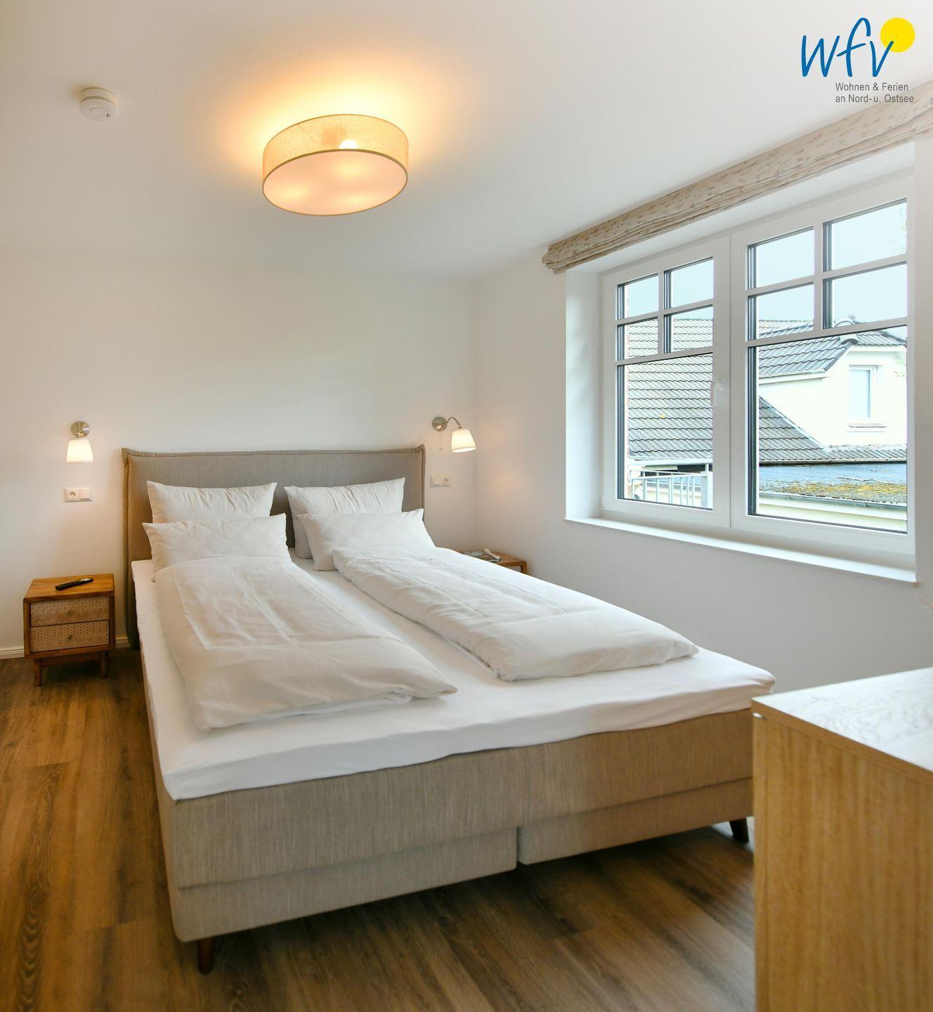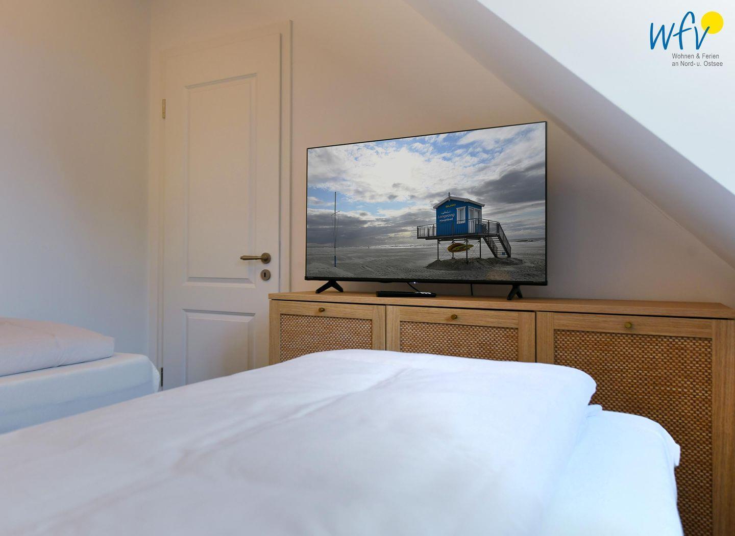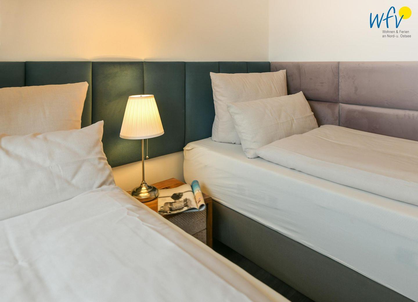 Die zwei separaten Schlafzimmer im Dachgeschoss bieten Ihnen sowohl Komfort, als auch Privatsphäre. Ein Schlafzimmer ist mit einem komfortablen Kingsize-Boxspringbett ausgestattet, das zweite Schlafzimmer beinhaltet zwei Einzelbetten, die bei Bedarf auch zusammengeschoben werden können.