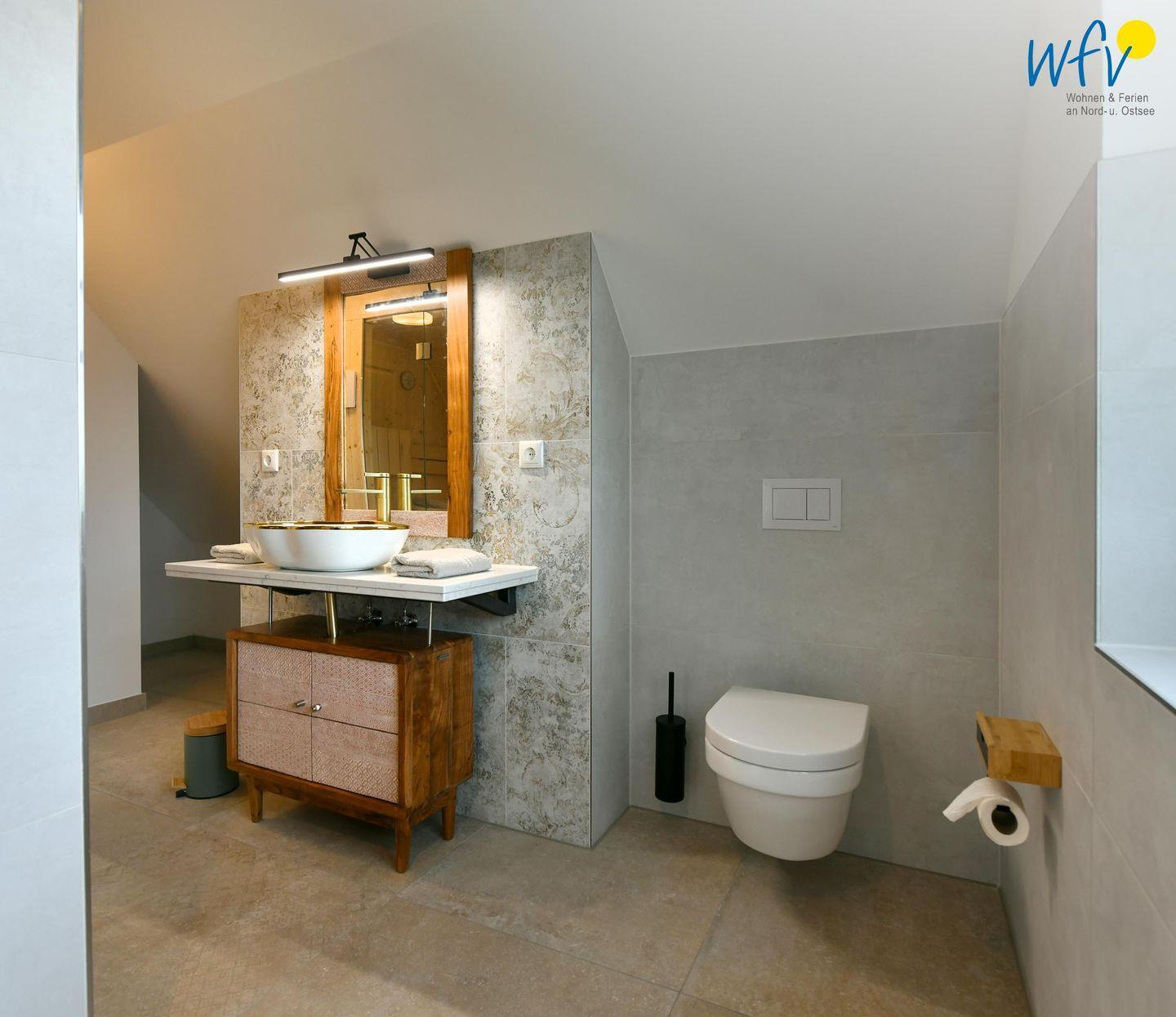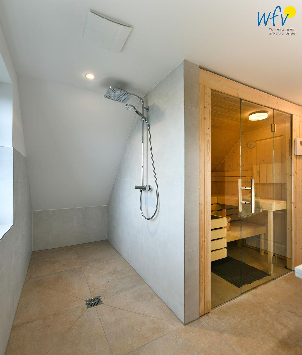 Ein Badezimmer im EG und ein elegantes Badezimmer im SP mit eigener Sauna und offenem Duschbereich sorgen für wohltuende Entspannungszeit und Ausweichmöglichkeiten.