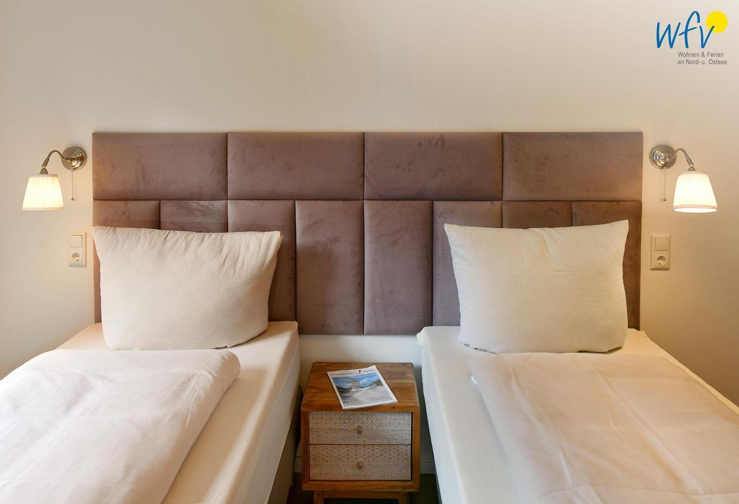 Die zwei separaten Schlafzimmer bieten Ihnen sowohl Komfort, als auch Privatsphäre. Ein Schlafzimmer ist mit einem komfortablen Kingsize-Boxspringbett ausgestattet, das zweite Schlafzimmer beinhaltet zwei Einzelbetten, die bei Bedarf auch zusammengeschoben werden können.