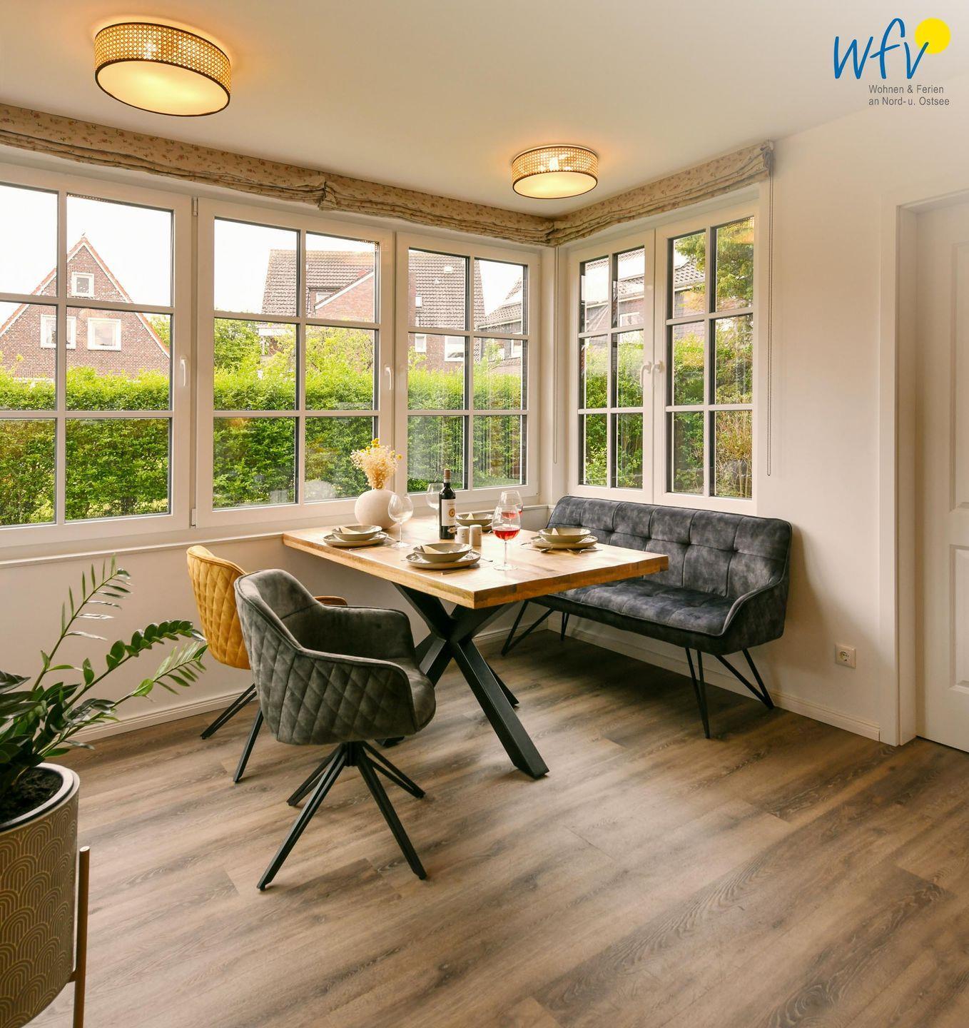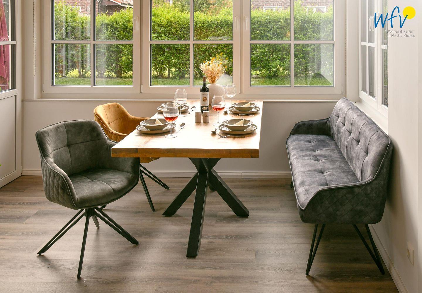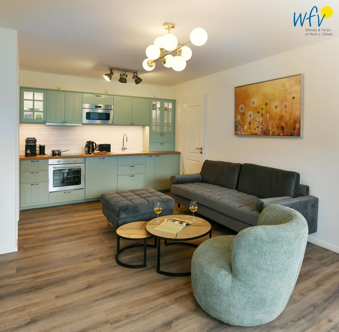Die Ferienwohnung verfügt über ein modernes, offenes Wohnkonzept, das für ein weites Raumgefühl sorgt. Wohnbereich und Küche sind harmonisch miteinander verbunden, sodass Sie hier nach dem Strandtag oder der Fahrradtour gemütliche Abende auf dem bequemen Sofa verbringen, fernsehen und lesen können oder das gemeinsame Kochen genießen. Für kulinarische Erlebnisse ist die moderne Küche mit einem 4-Platten-Induktionsherd, einem Backofen, einer Mikrowelle, einem Kühlschrank mit Gefrierfach sowie einer Spülmaschine ausgestattet. Der Essbereich mit breiter Fensterfront und schönem Lichteinfall lädt zu entspannten Mahlzeiten ein.
