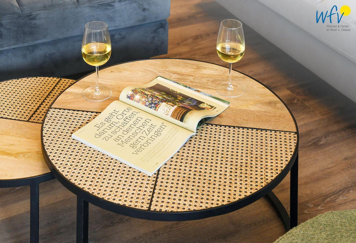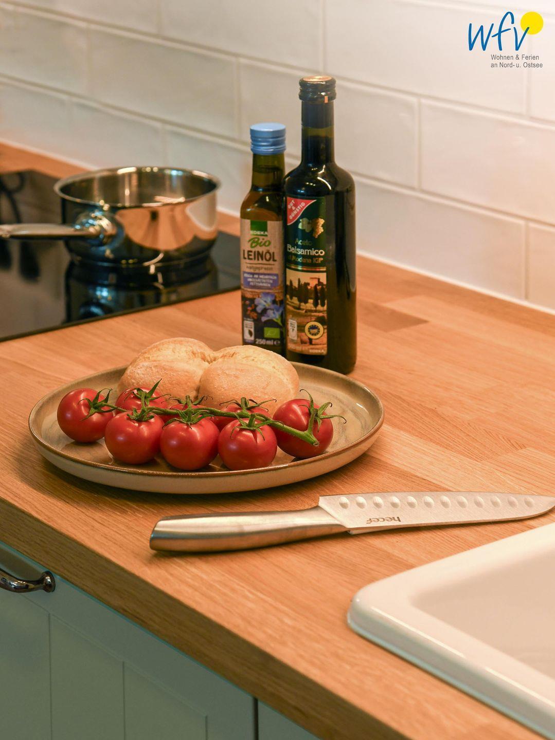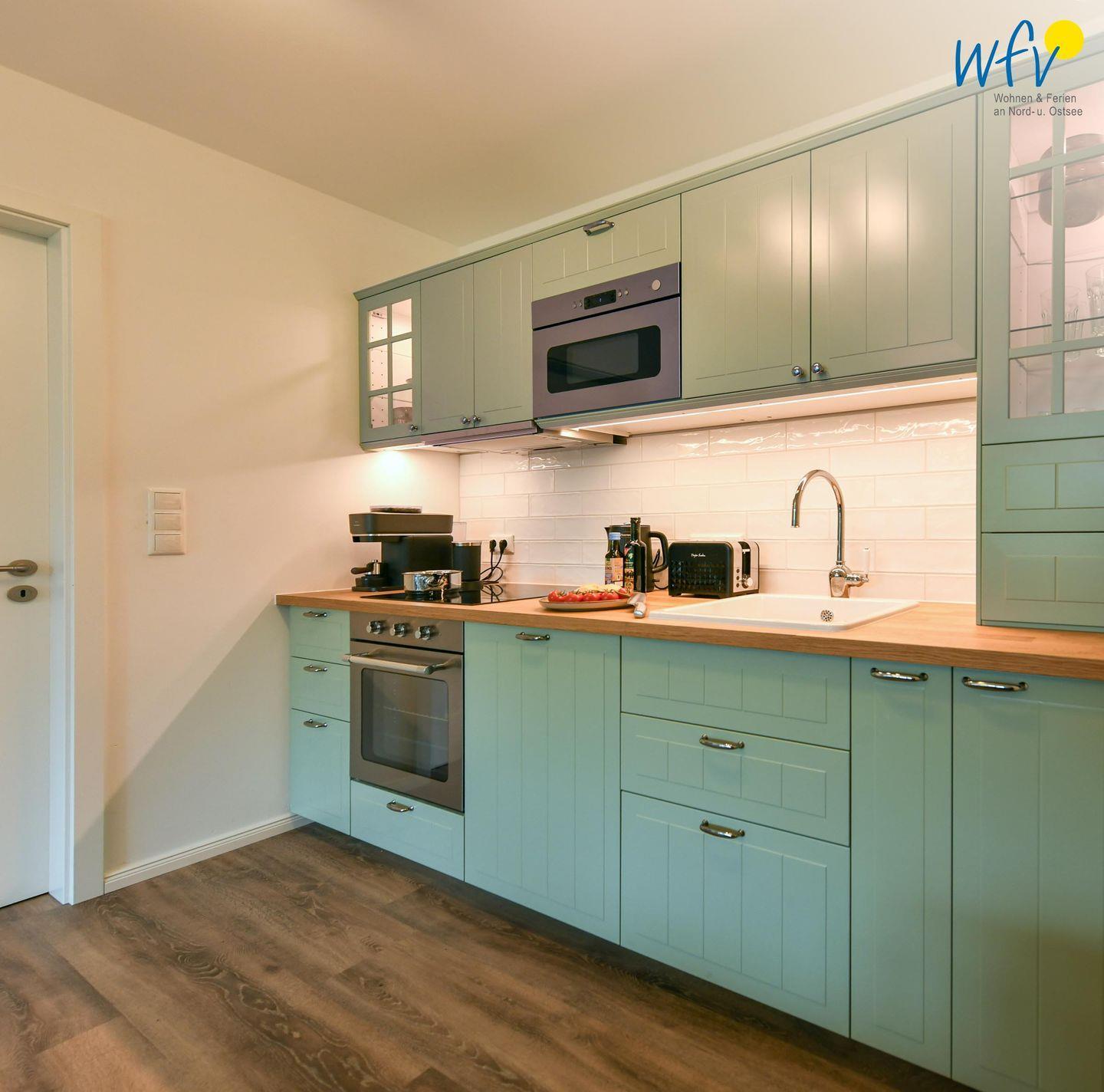 Die Ferienwohnung verfügt über ein modernes, offenes Wohnkonzept, das für ein weites Raumgefühl sorgt. Wohnbereich und Küche sind harmonisch miteinander verbunden, sodass Sie hier nach dem Strandtag oder der Fahrradtour gemütliche Abende auf dem bequemen Sofa verbringen, fernsehen und lesen können oder das gemeinsame Kochen genießen. Für kulinarische Erlebnisse ist die moderne Küche mit einem 4-Platten-Induktionsherd, einem Backofen, einer Mikrowelle, einem Kühlschrank mit Gefrierfach sowie einer Spülmaschine ausgestattet. Der Essbereich mit breiter Fensterfront und schönem Lichteinfall lädt zu entspannten Mahlzeiten ein.